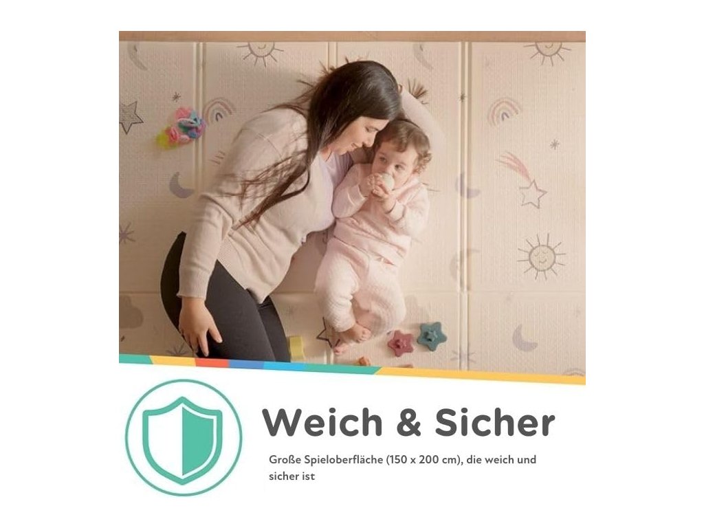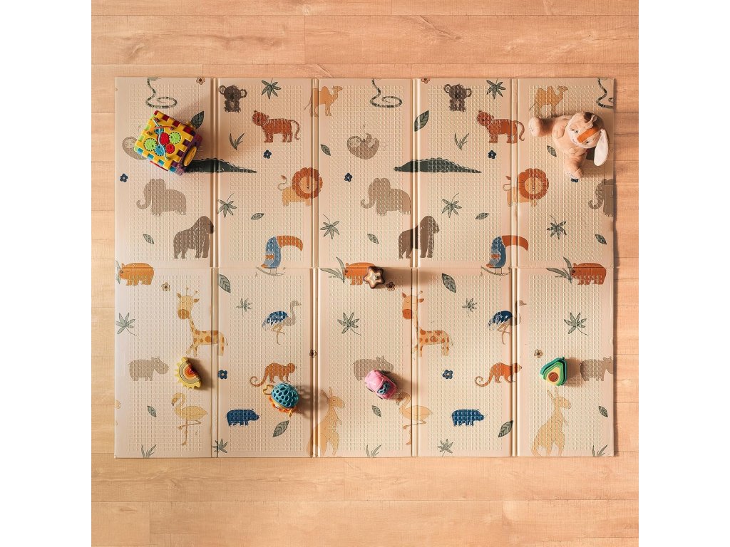 Podložka je lehká, snadno skládací a otočná, což umožňuje jednoduché uložení i přenášení. Povrch je příjemný na dotek, tlumí nárazy a izoluje od studené podlahy. Veselý dětský motiv podporuje rozvoj smyslů a zaujme děti při hře.