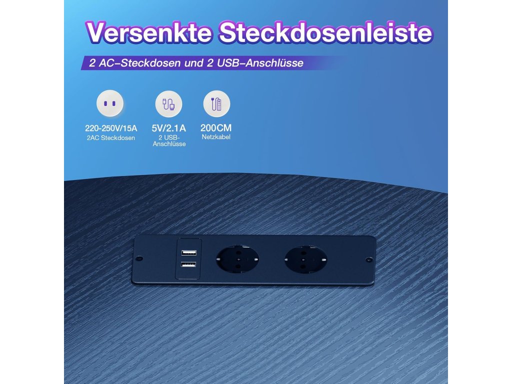 Stůl je vybaven 2 integrovanými elektrickými zásuvkami a 2 USB nabíjecími porty, díky nimž můžete snadno napájet počítač, monitor, telefon nebo další zařízení přímo na stole. Praktická plocha na monitor pomáhá udržet správnou ergonomii při dlouhém sezení.