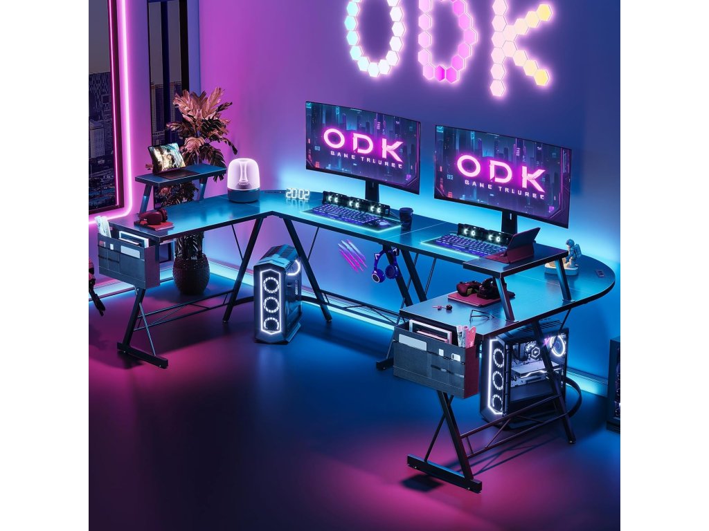 Herní stůl ODK je navržen pro maximální pohodlí při hraní her, práci na počítači i studiu. Rohové provedení do tvaru L nabízí velkou pracovní plochu, která bez problémů pojme více monitorů, klávesnici, myš i další herní příslušenství.