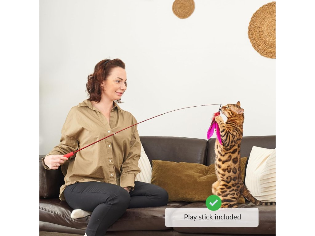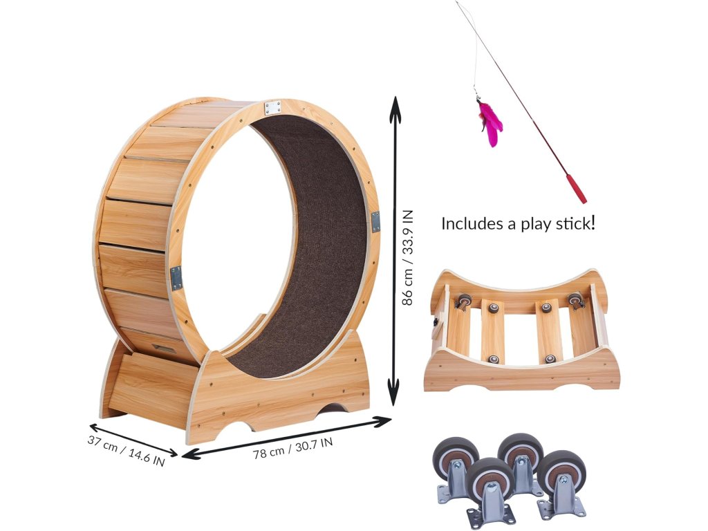 Díky velkému průměru je kolo vhodné i pro větší plemena koček. Tichý chod zajišťují ložisková kolečka, která neruší domácnost ani při intenzivním používání. Součástí balení je také hrací prut s peříčky pro snadnější motivaci kočky k pohybu.