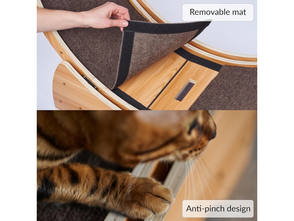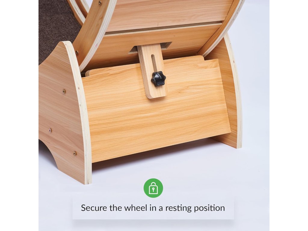 Kolo je vyrobeno z kvalitního masivního dřeva s pevnou základnou, která zajišťuje vysokou stabilitu při používání. Vnitřní běžecká plocha je opatřena protiskluzovým povrchem pro bezpečný a pohodlný pohyb tlapek.