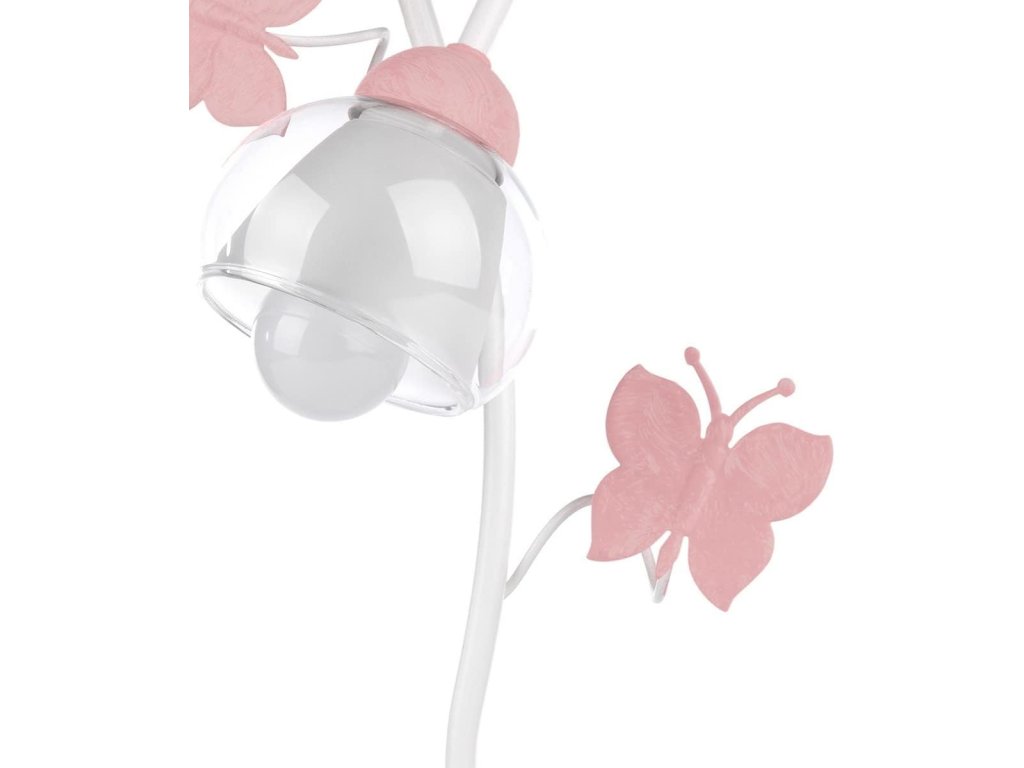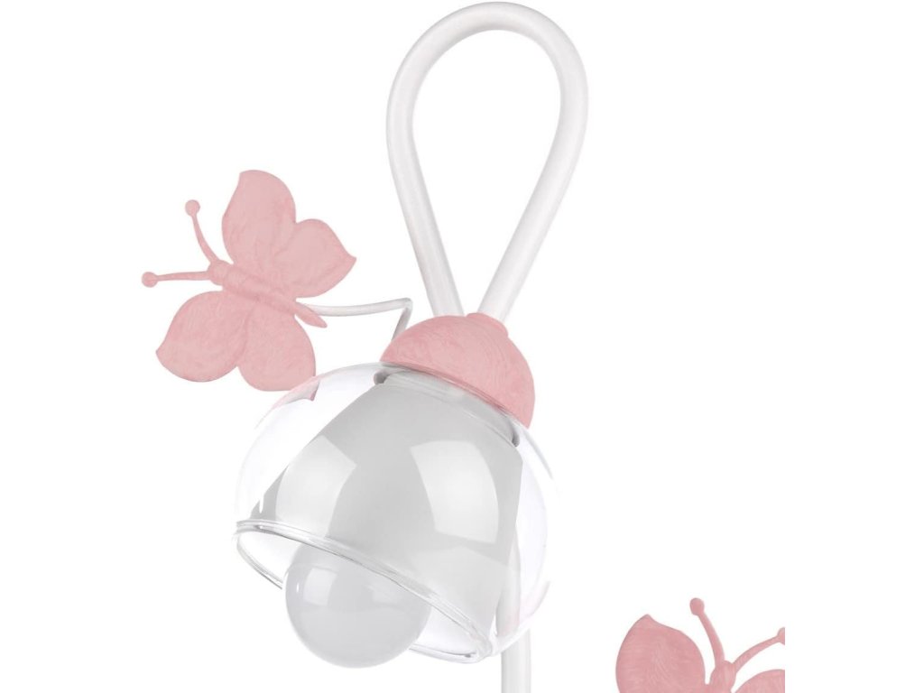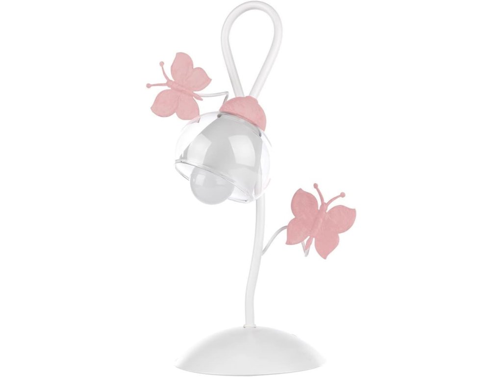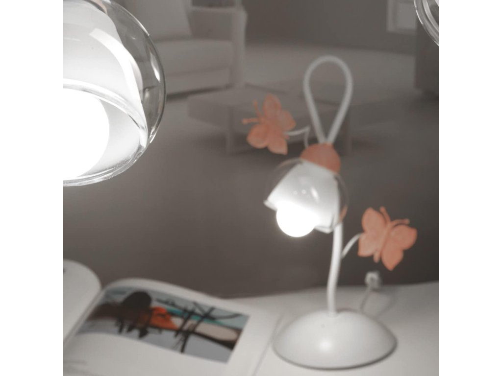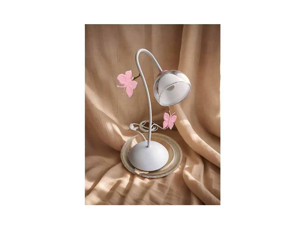 Stolní lampa ONLI Motýli je jemným a stylovým doplňkem interiéru, který vyniká svým romantickým designem. Kombinace bílé kovové konstrukce a průhledného skla s růžovými ručně malovanými motýly vytváří lehký a elegantní vzhled.