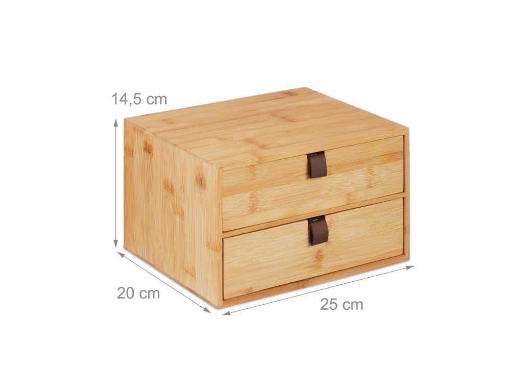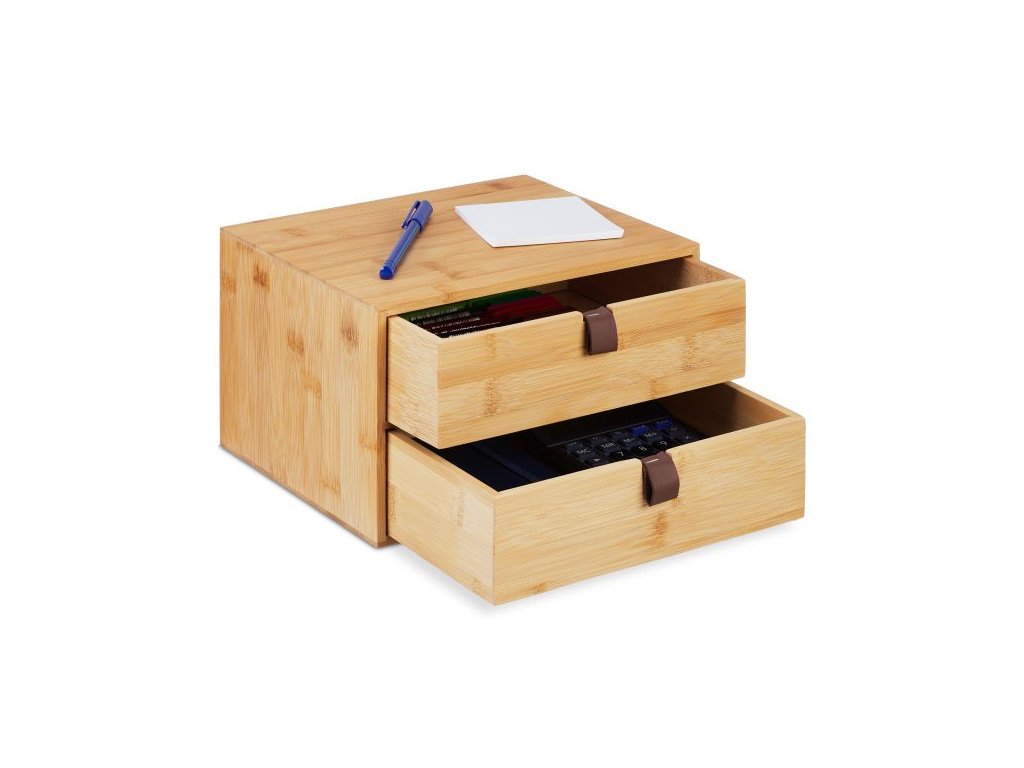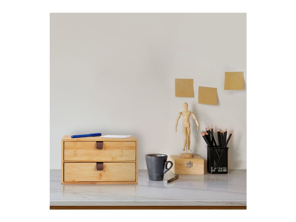 Udržte si pořádek na pracovním stole stylově a přehledně. Tento elegantní organizér z přírodního bambusu nabízí dvě praktické zásuvky pro uložení kancelářských potřeb, dokumentů i drobné elektroniky.