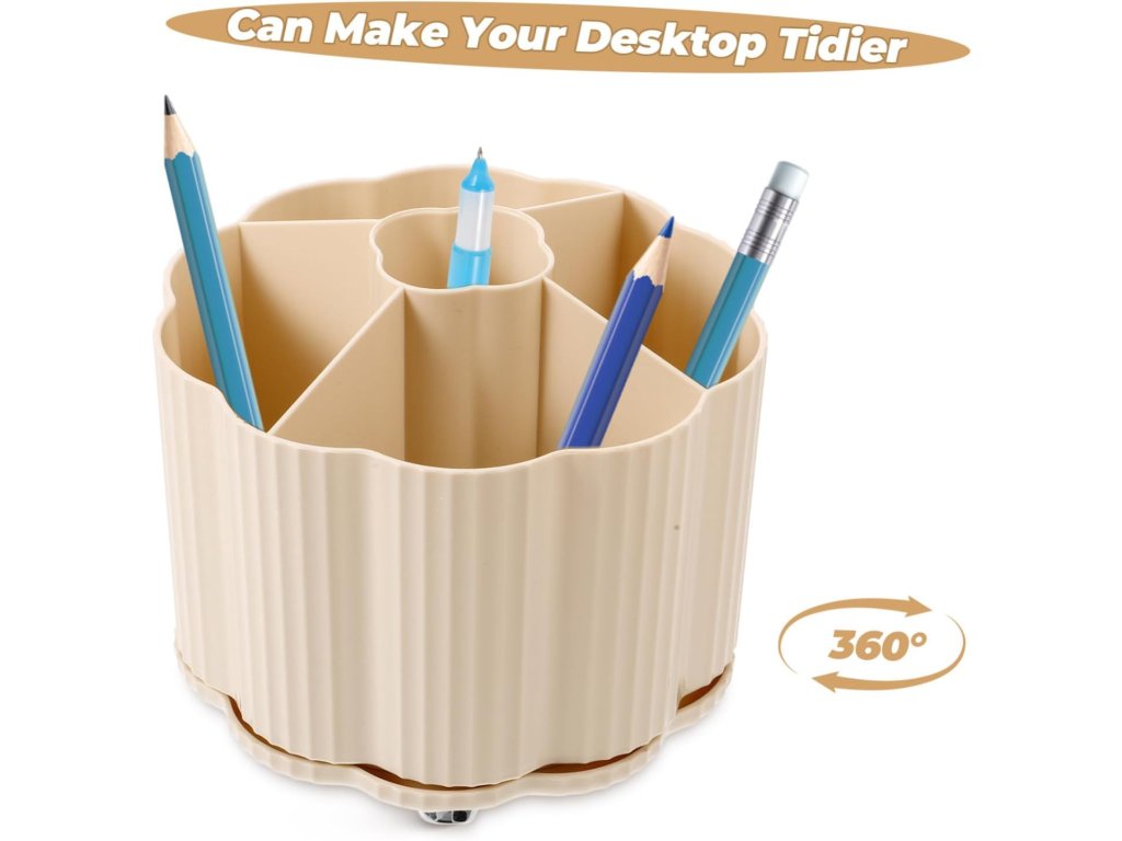 Praktický stolní organizér s možností otáčení o 360° je ideální pro ukládání psacích potřeb, kancelářských doplňků, kosmetiky či drobných předmětů. Díky otočné základně umožňuje rychlý a pohodlný přístup ke všem přihrádkám. Stylový design a pevné provedení zajišťují dlouhou životnost a stabilitu při používání.