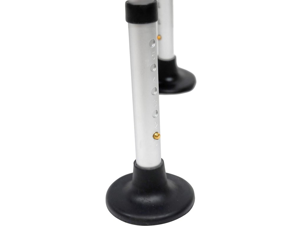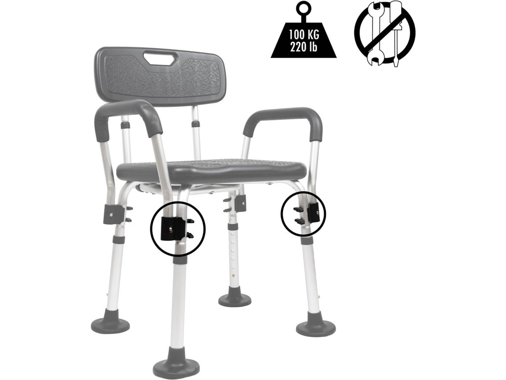 Židle je vybavena opěrkou zad a područkami pro snadnější vstávání i usedání. Výška sedu je nastavitelná, takže ji lze přizpůsobit individuálním potřebám uživatele. Robustní hliníková konstrukce je lehká, odolná proti korozi a vhodná do vlhkého prostředí.
