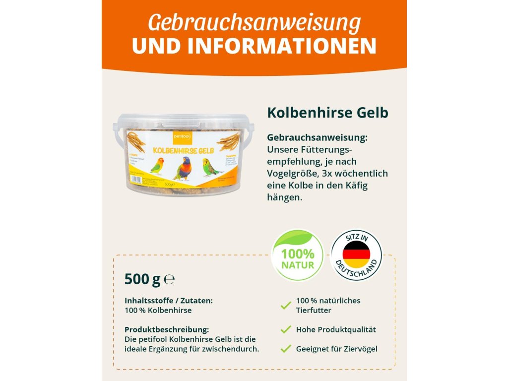 Luční proso žluté petifool je kvalitní přírodní krmivo určené pro všechny druhy okrasných ptáků. Jedná se o 100% přírodní produkt bez jakýchkoliv přidaných látek, konzervantů nebo barviv. Proso je dodáváno v klasech, což podporuje přirozené zobání a aktivitu ptáků.