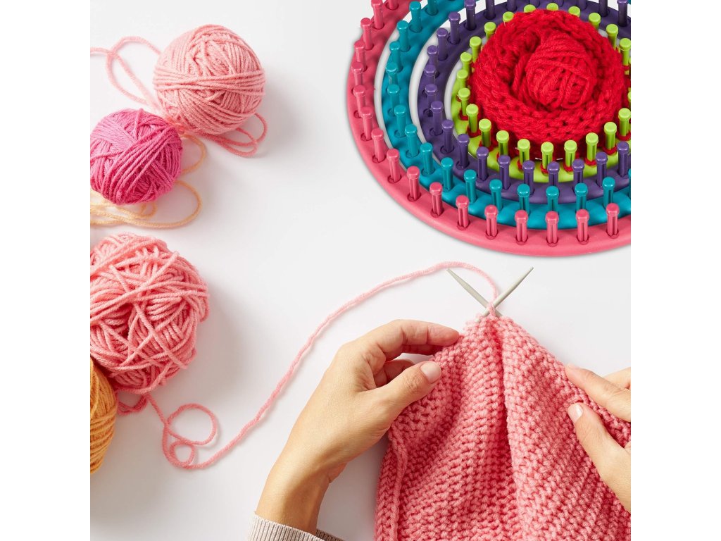 Pomocí jednotlivých kruhů lze vytvářet čepice, nákrčníky, šály, návleky i dětské doplňky. Stačí příze a pár jednoduchých kroků – pletení na stavech je intuitivní a zábavné.