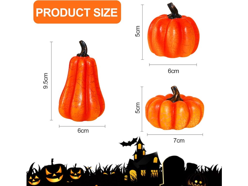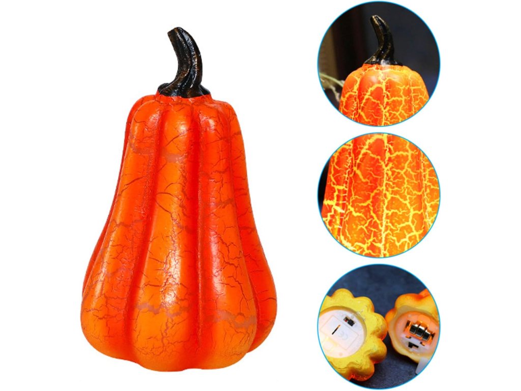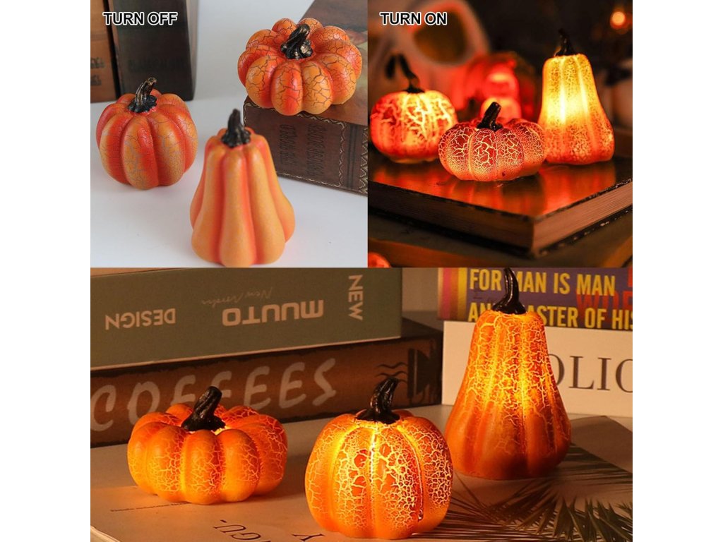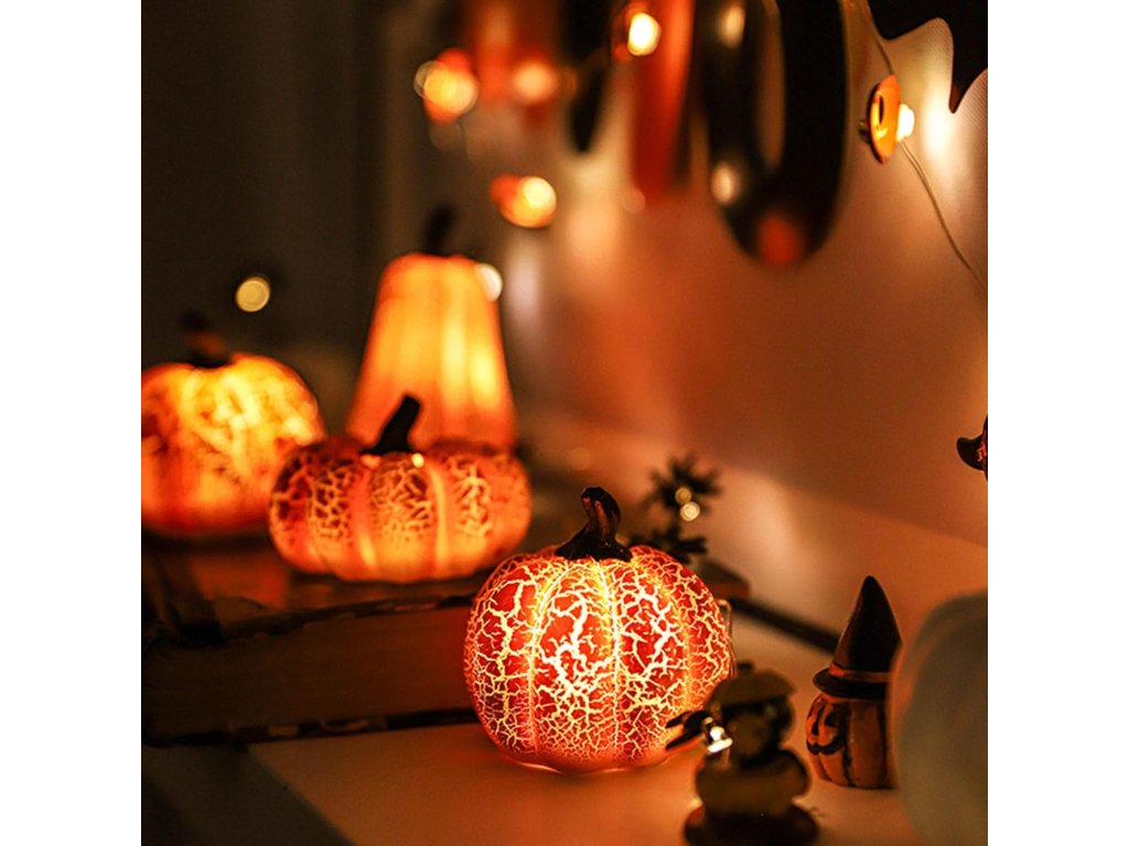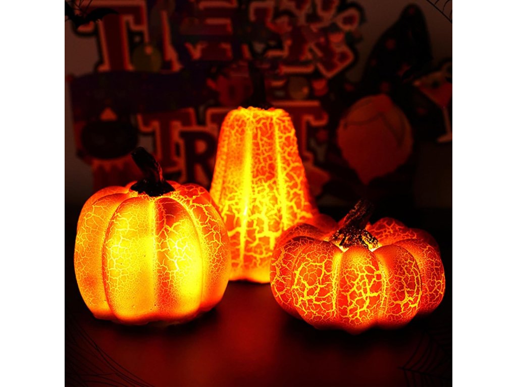 Sada obsahuje tři svítící dekorace v různých tvarech dýní s jemným prasklým efektem povrchu, který při rozsvícení vytváří efektní světelnou strukturu. Teplé LED světlo působí příjemně a nenápadně, ideální pro večerní dekoraci.