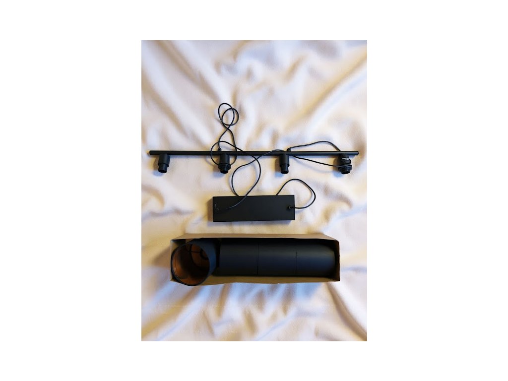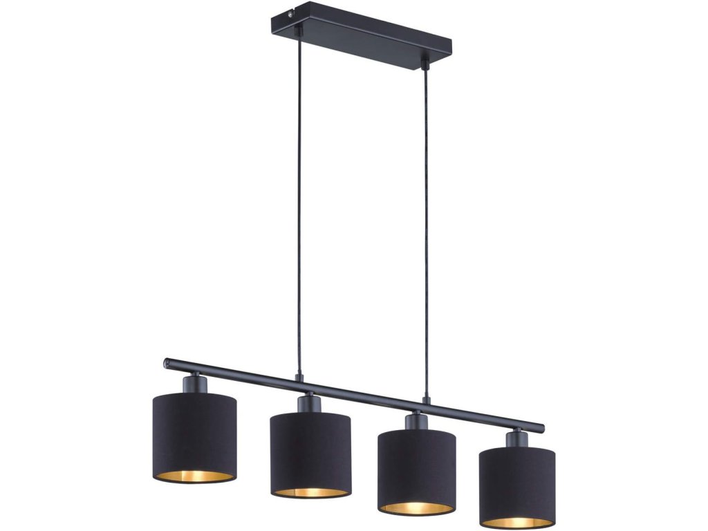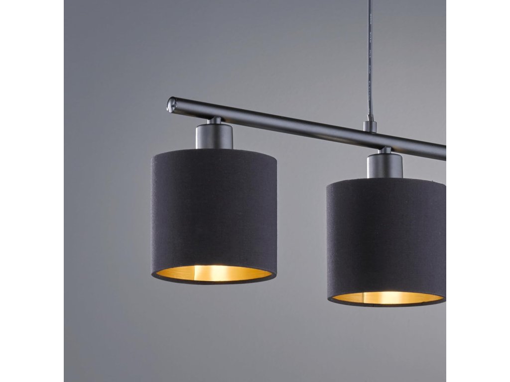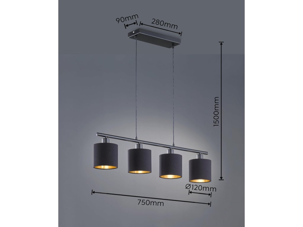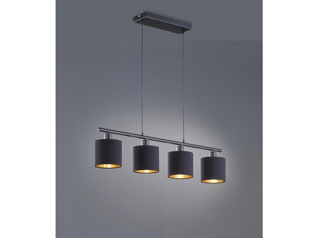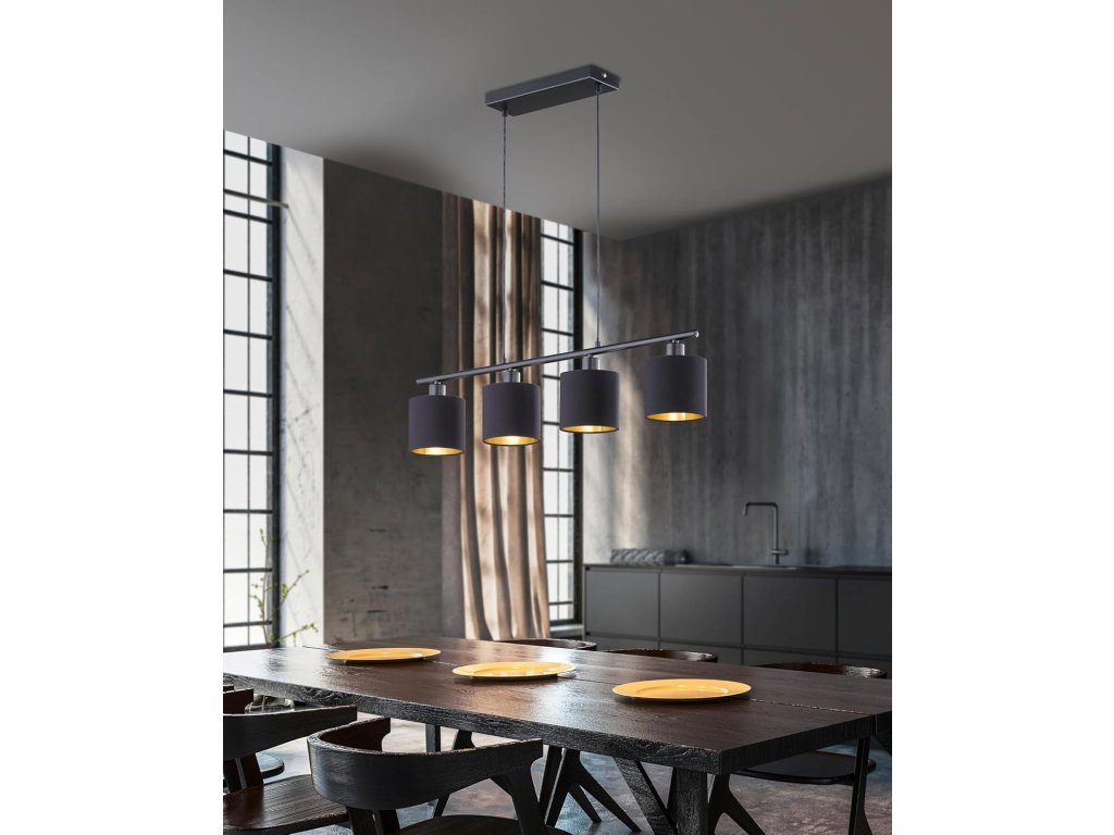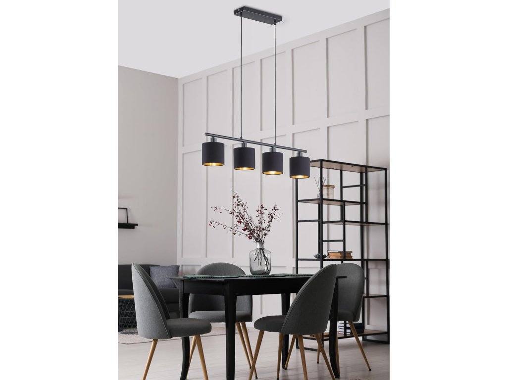 Čtyři látková stínidla v černém provedení jsou zavěšena na kovové konstrukci v matné černé barvě, která působí minimalisticky a zároveň velmi stylově. Svítidlo vytváří příjemné, směrované světlo ideální nad jídelní stůl, kuchyňský ostrůvek nebo do obývacího pokoje.