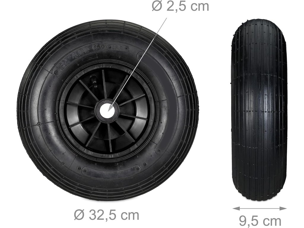 Náhradní kolo na trakař Relaxdays je praktickým řešením pro opravu nebo výměnu opotřebovaného kola u zahradních a stavebních koleček. Pneumatika o rozměru 4.00-6 zajišťuje dobré tlumení nerovností a pohodlný pojezd i na nezpevněném povrchu.