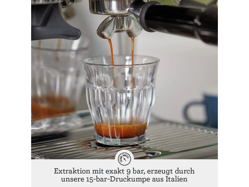 - Optimální teplota: Přesná teplota vody 93 °C ve spojení s předspařováním s nízkým tlakem, při kterém se postupně zvyšuje tlak, zajišťuje rovnoměrné rozložení aromat a tím i krémové espresso