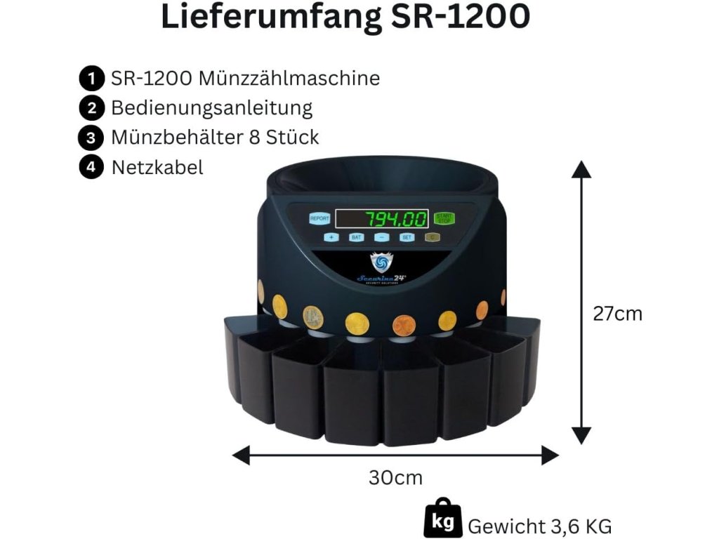 Počítačka mincí Securina24 SR1200LC je praktické zařízení určené pro rychlé a přesné počítání euro mincí. Je vhodná pro obchody, restaurace, kanceláře i domácí použití, kde je potřeba efektivně zpracovávat hotovost.
