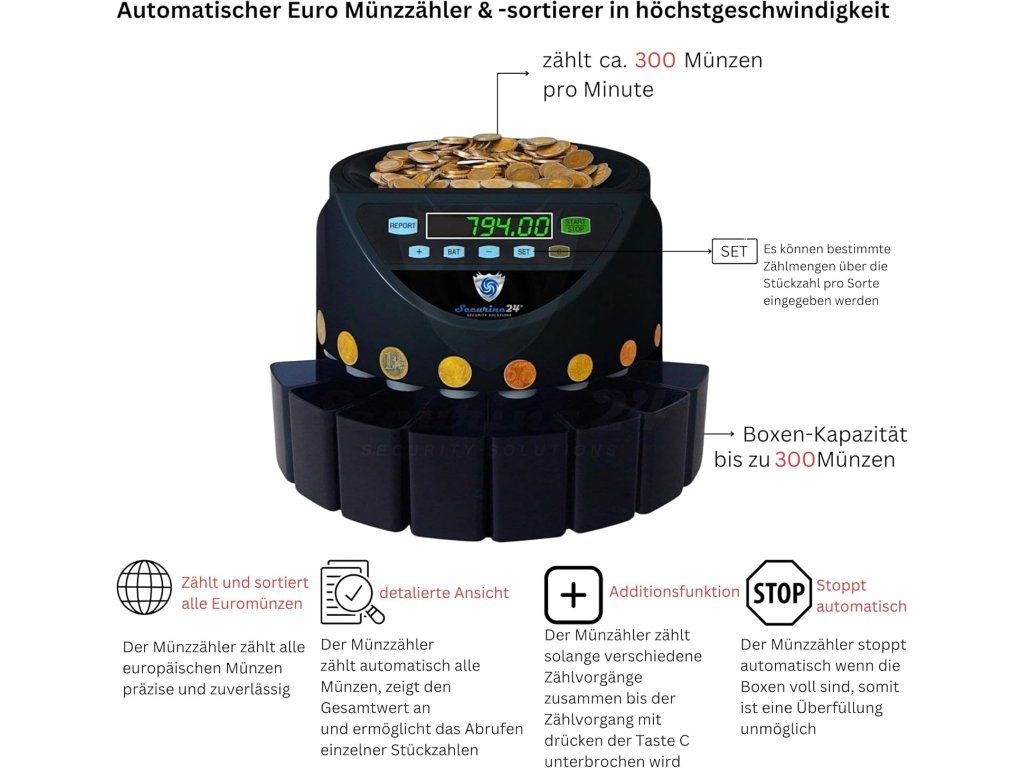 Přístroj automaticky rozpoznává jednotlivé nominální hodnoty euro mincí a třídí je do samostatných zásobníků. Přehledný LCD displej zobrazuje celkovou hodnotu spočítaných mincí i hodnoty jednotlivých nominálů.