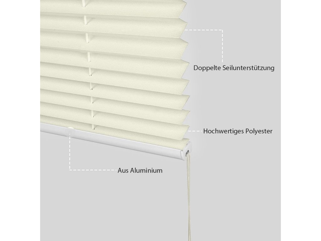 Plisé lamely jsou vyrobeny z kvalitní tkaniny, která reguluje světlo a zajišťuje příjemné prostředí v interiéru. Textilie je prodyšná, netoxická a odolná vůči UV záření, takže si dlouho udrží barvu a funkčnost. Stínění lze snadno posouvat nahoru i dolů pro optimální ochranu proti světlu nebo soukromí.