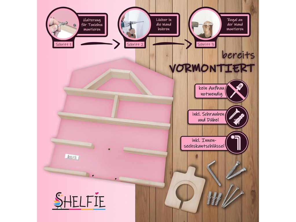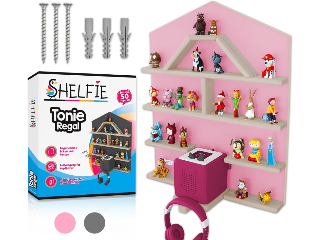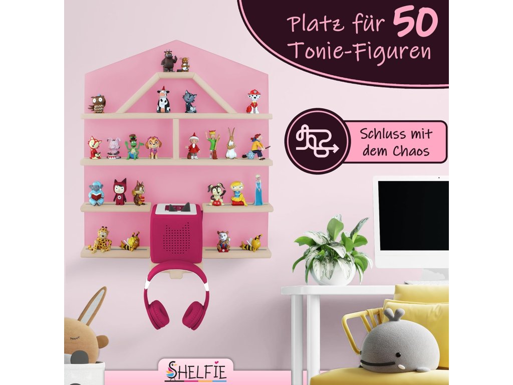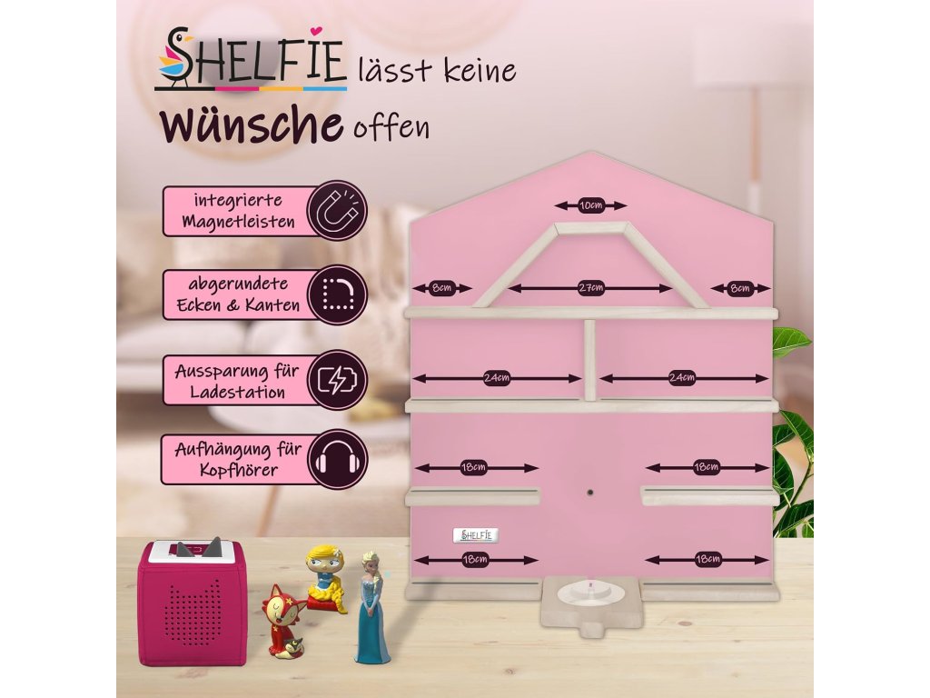 SHELFIE Tonie-Regal je praktická a stylová nástěnná police navržená speciálně pro ukládání Tonieboxu, Tonie figurek a příslušenství. Díky magnetickým policím udrží figurky bezpečně na svém místě a zároveň je umožní snadno přehledně vystavit.