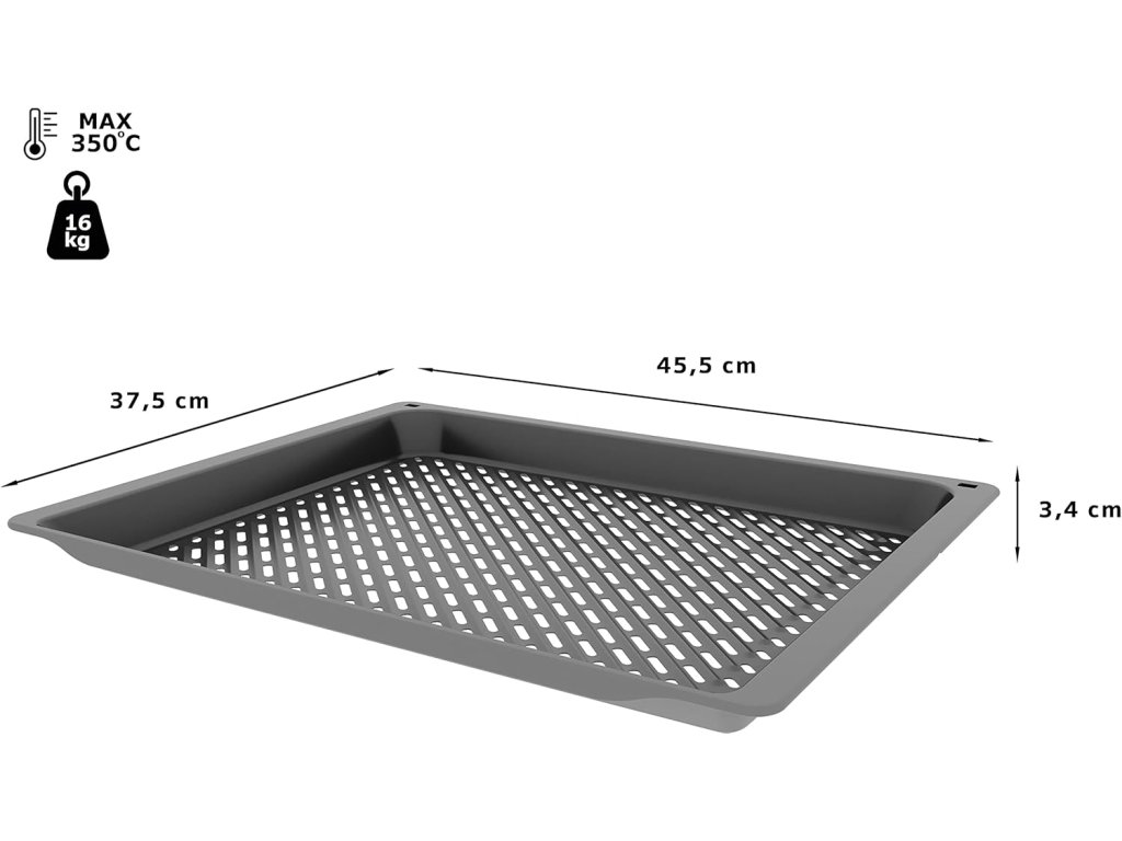 Plech je vyroben z kvalitní smaltované oceli, která zajišťuje vysokou odolnost vůči teplotám až 350 °C. Díky robustní konstrukci unese až 16 kg a je vhodný i pro grilování, pečení zeleniny, hranolků nebo masa.