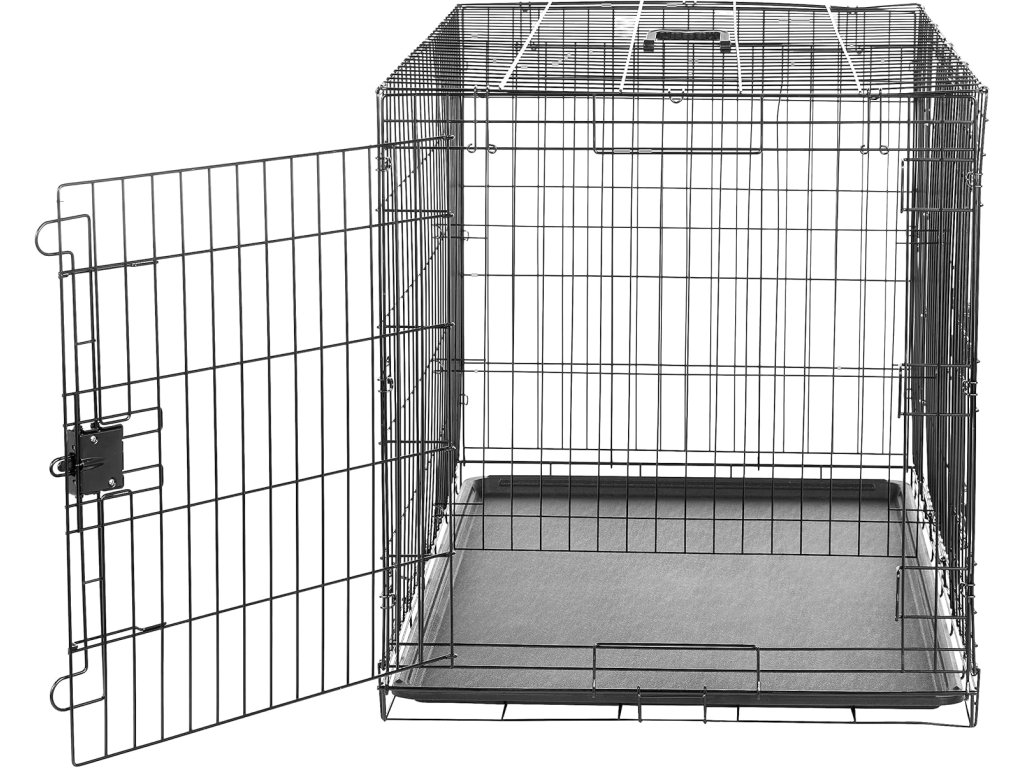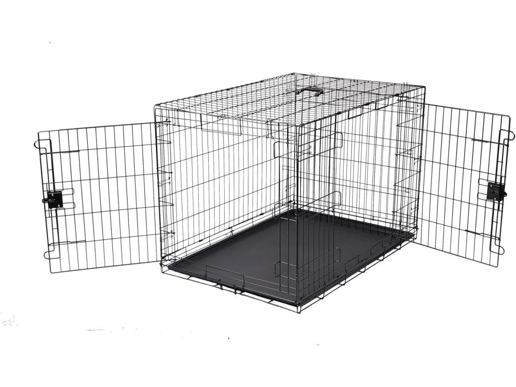 Skládací psí klec z kovového drátu s plastovou vanou, dvojité dveře, černá, 107 × 71 × 76 cm