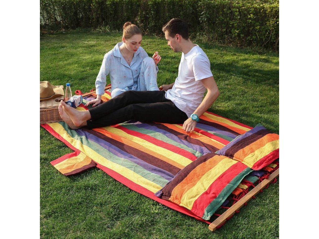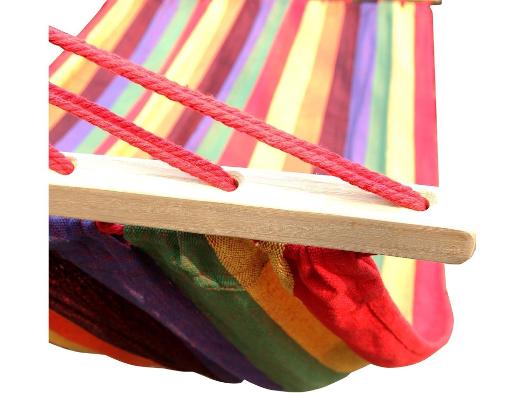 Pevná tkanina v barevném provedení je příjemná na dotek a zároveň odolná. Dřevěné rozpěrné tyče zajišťují stabilní tvar sítě a rovnoměrné rozložení váhy. Vysoká nosnost až 300 kg umožňuje bezpečné používání.