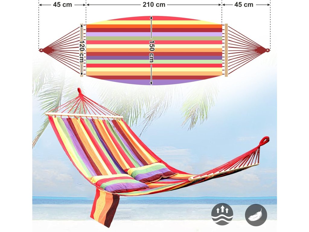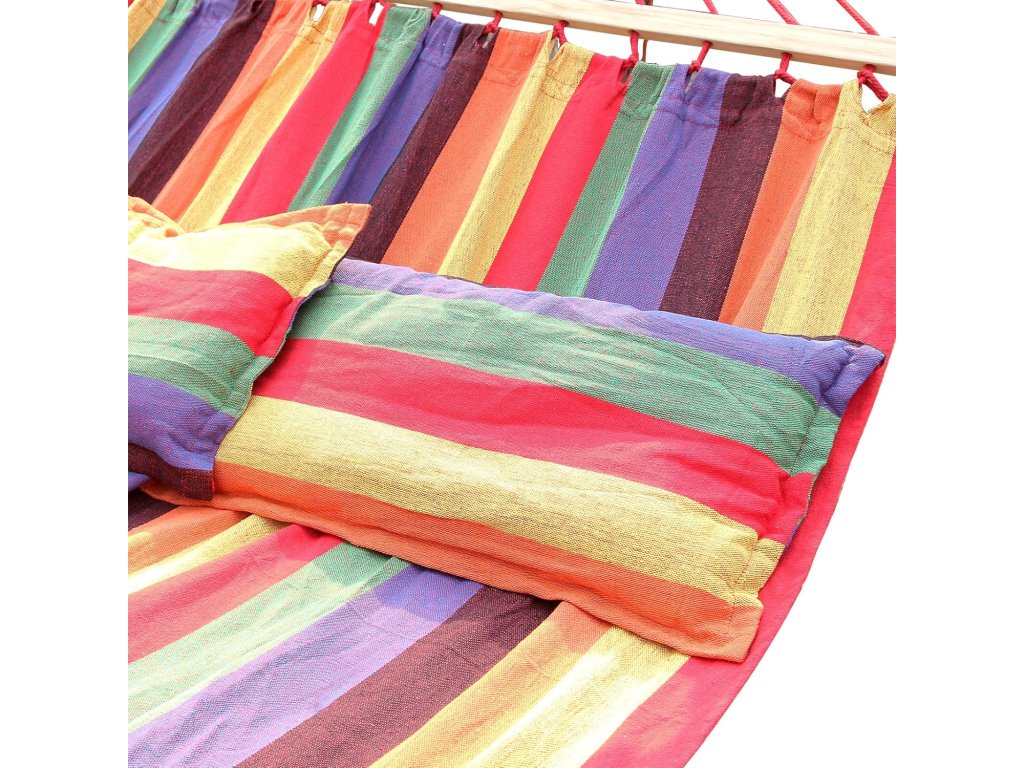 Součástí balení jsou dva polštáře, které zvyšují komfort při odpočinku. Houpací síť je vhodná na zahradu, terasu, balkon i do interiéru.
