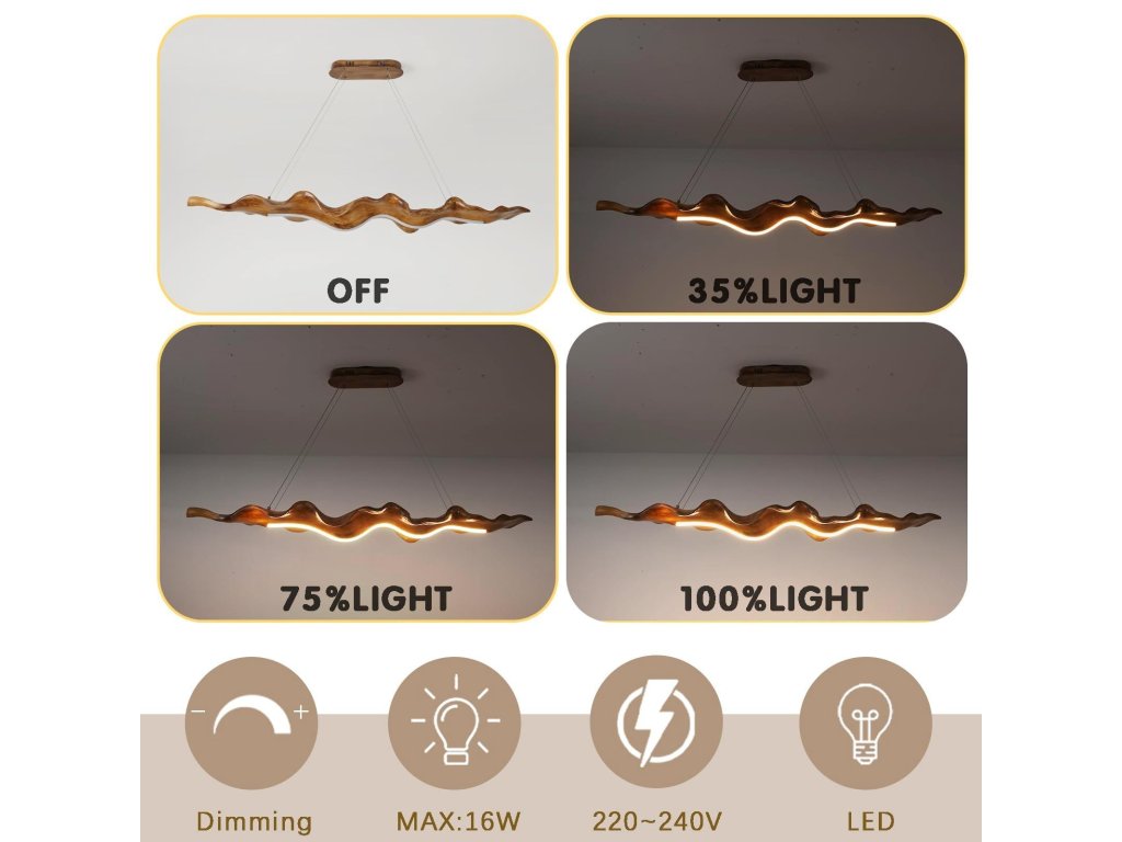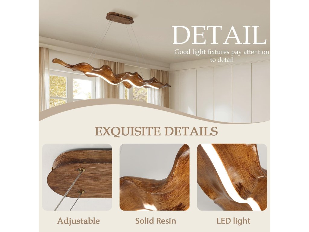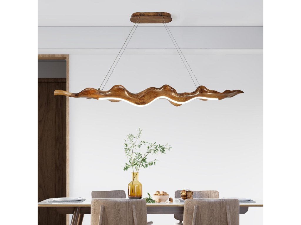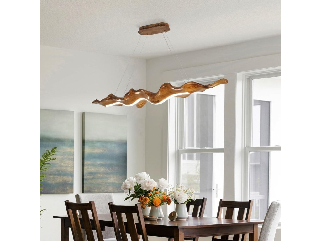Závěs je výškově nastavitelný až do 1 metru, takže svítidlo přizpůsobíte výšce stropu i konkrétnímu prostoru. Konstrukce kombinuje kov a pevnou pryskyřici s povrchovou úpravou imitující dřevo a integrovaným LED zdrojem pro úsporný provoz.