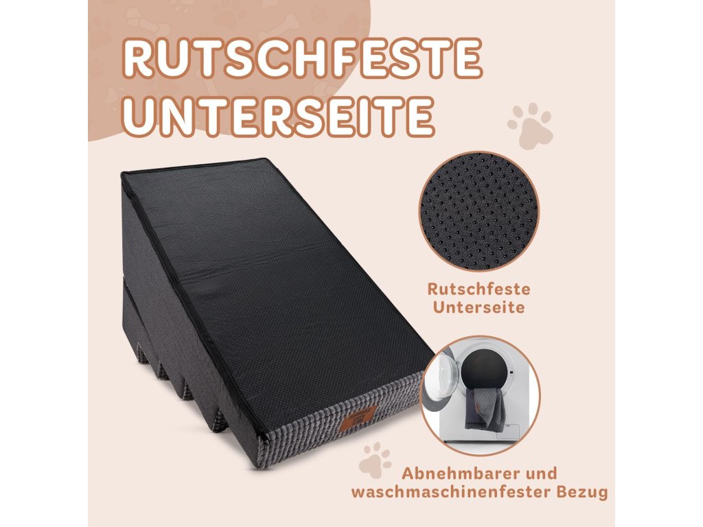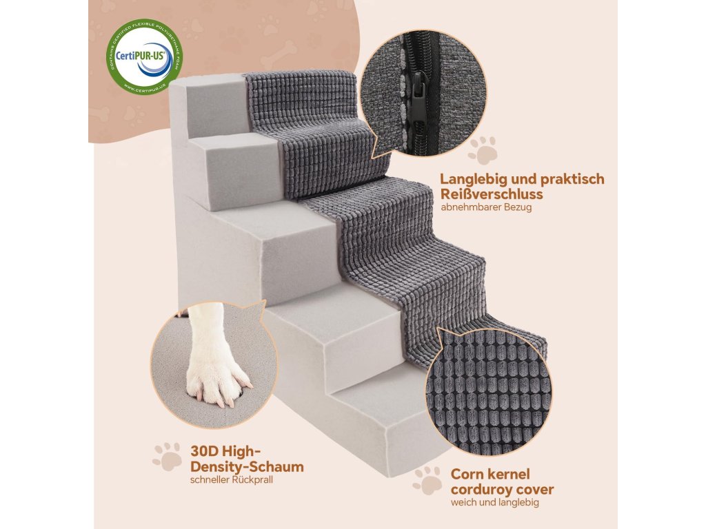 Potah schodů je odnímatelný a pratelný, což zajišťuje snadnou údržbu a hygienické prostředí pro vašeho mazlíčka.