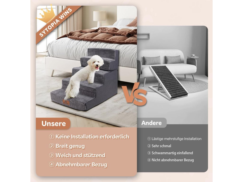 Schody pro psy Sytopia jsou ideálním řešením pro malé, starší nebo zraněné psy, kteří potřebují snadný přístup na postel, pohovku nebo jiné vyvýšené místo.