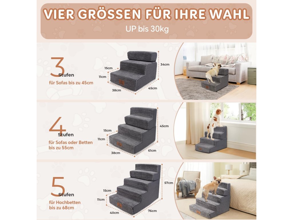 Praktická konstrukce nabízí 5 pohodlných stupňů, které umožňují psům postupně vystoupat do výšky až 57 cm.
