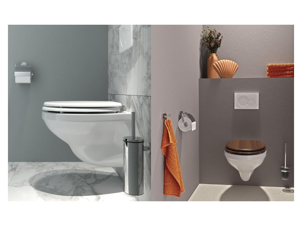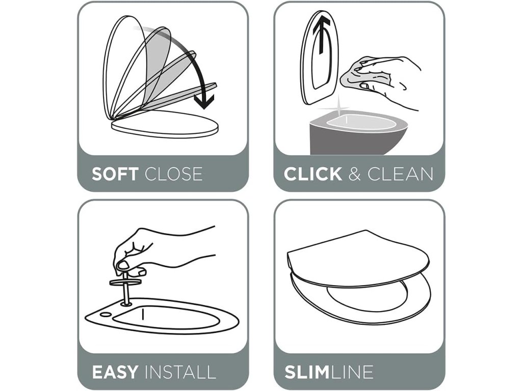 Elegantní design: Extrémně ploché sedátko dodává toaletě stylový vzhled a zároveň je stejně stabilní a pohodlné jako tradiční toaletní sedátko. Záchodové sedátko ve tvaru D, které perfektně pasuje na závěsné toalety nebo toalety s rovnými bočními stěnami.