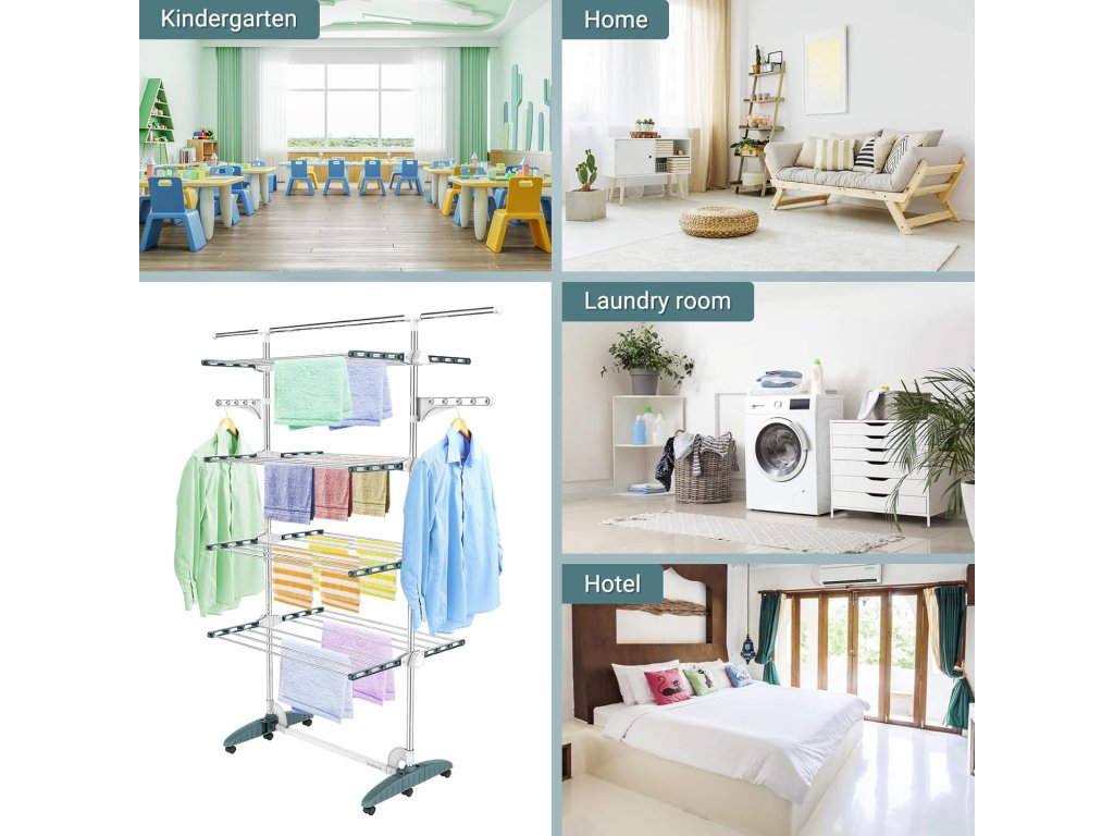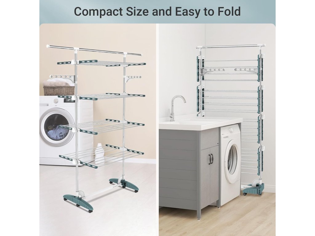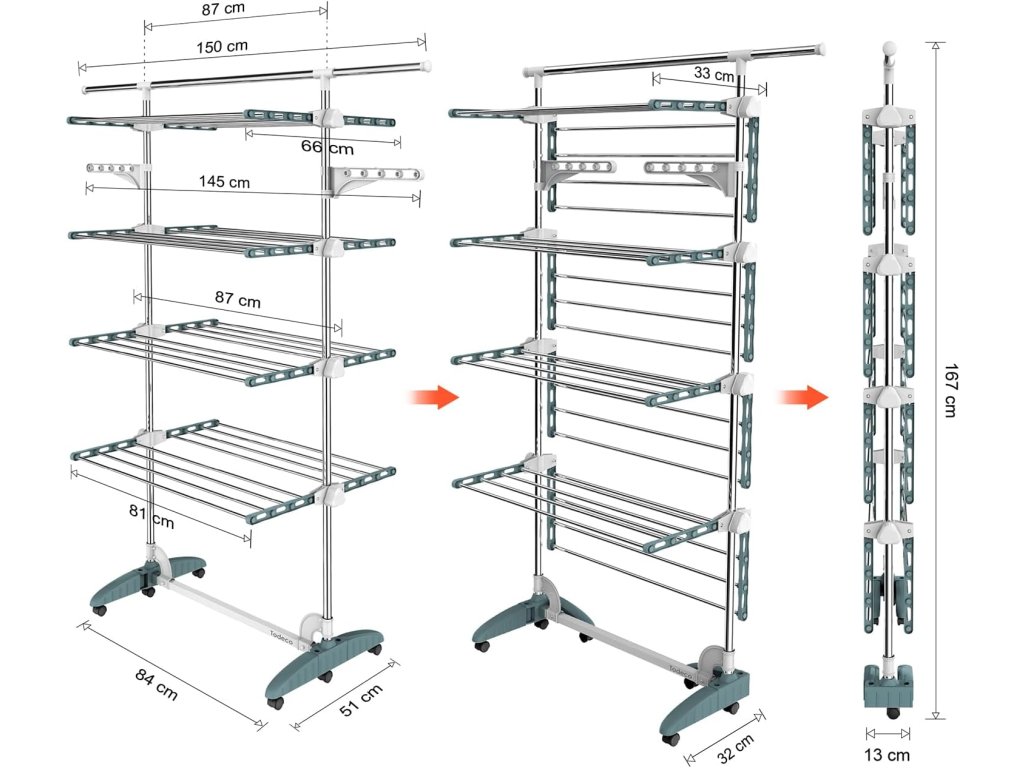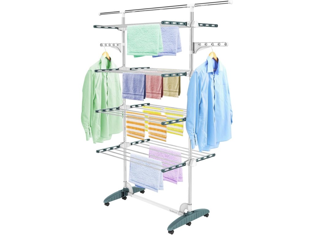 Věžový stojan na prádlo Todeco se čtyřmi patry nabízí velkou sušicí plochu při minimálních nárocích na prostor. Díky vertikálnímu provedení je ideální do menších bytů, koupelen nebo na balkon. Stojan je vybaven kolečky pro snadnou manipulaci a bočními rameny vhodnými pro zavěšení košil a halenek na ramínkách.