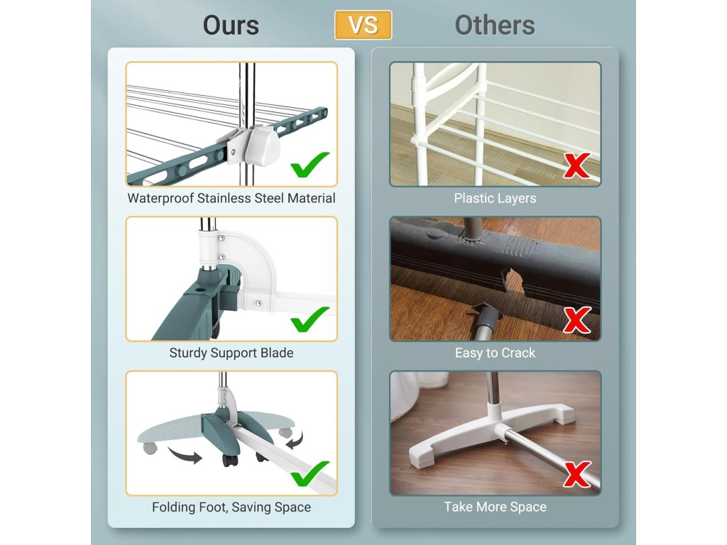 Kovová konstrukce zajišťuje stabilitu a dlouhou životnost, plastové spoje usnadňují montáž a manipulaci. Stojan lze snadno složit pro úsporné skladování.
