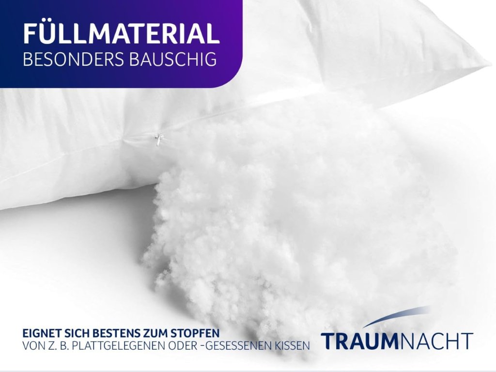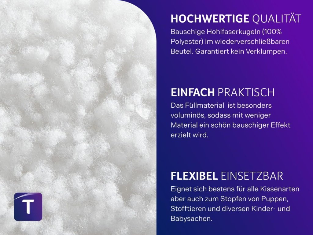 Kvalitní prodyšná výplň z dutých polyesterových vláken značky Traumnacht je ideální volbou pro výrobu a doplňování polštářů, dekoračních polštářků, hraček nebo kreativní šití. Díky lehké a nadýchané struktuře si materiál dlouhodobě udržuje objem a tvar.