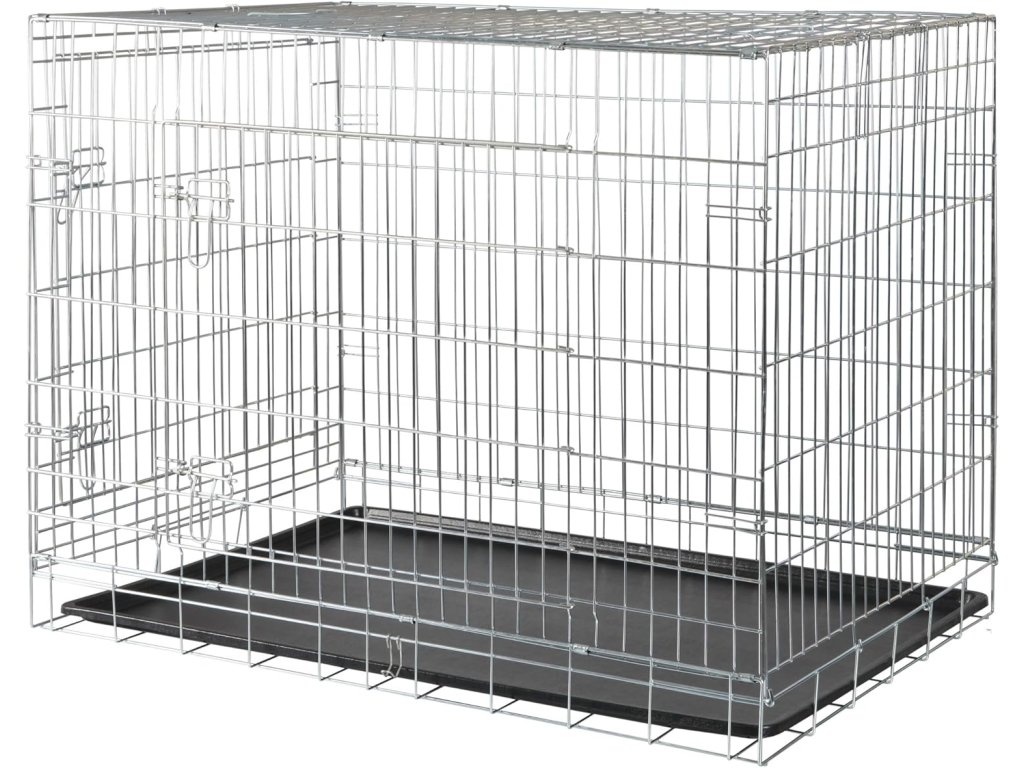 Klec je vybavena dvěma dvířky pro pohodlný vstup zepředu i z boku. Bezpečnostní uzávěry zabraňují nechtěnému otevření a zajišťují bezpečí psa. Robustní pozinkovaná konstrukce je odolná a stabilní.