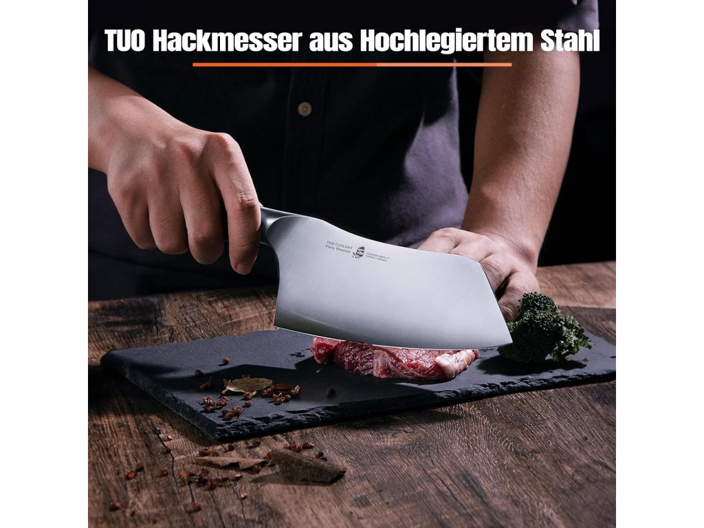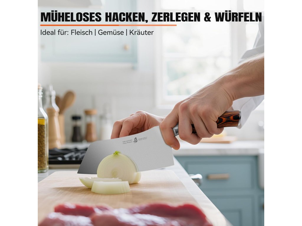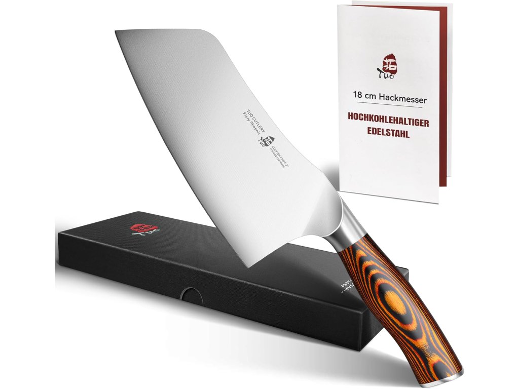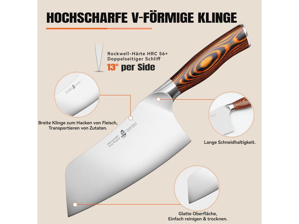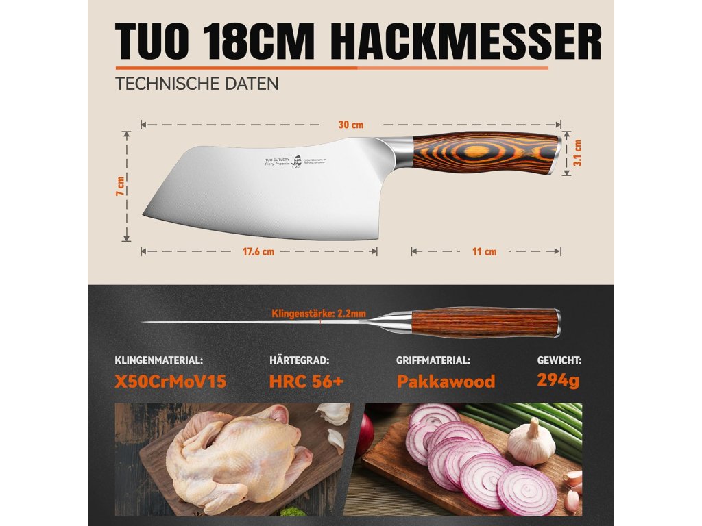 Sekací nůž TUO Fiery Phoenix Series o délce čepele 18 cm je profesionální kuchyňský nástroj navržený pro maximální výkon, přesnost a dlouhou životnost. Díky široké a robustní čepeli je ideální pro sekání masa, porcování, krájení zeleniny i rychlou práci v kuchyni.