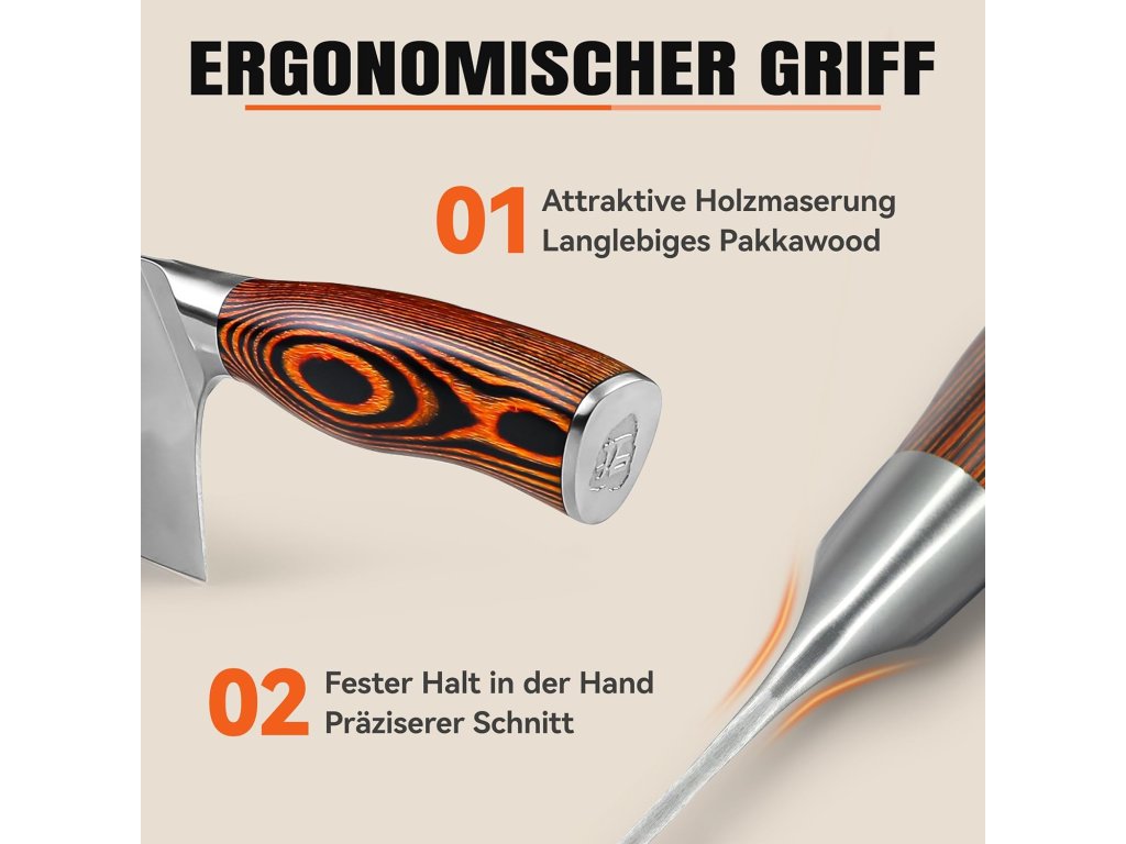 Ergonomická rukojeť z materiálu Pakkawood nabízí pevný a bezpečný úchop i při delším používání. Dokonalé vyvážení nože umožňuje komfortní manipulaci a profesionální kontrolu při každém řezu.