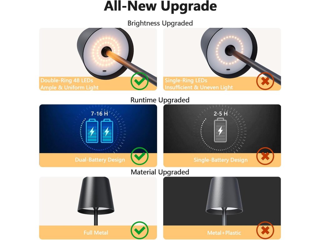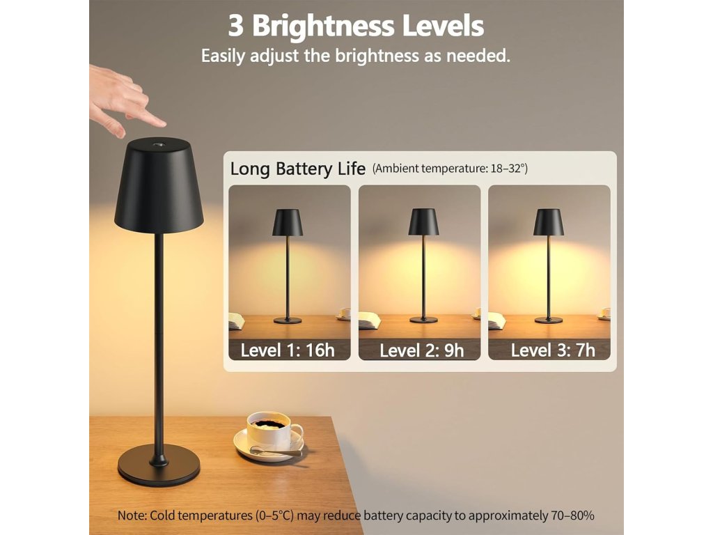 Elegantní a moderní LED stolní lampa UPXNBOR je ideálním řešením pro noční stolek, pracovní stůl, restauraci, terasu i zahradu. Díky integrované baterii funguje zcela bez kabelů a poskytuje maximální flexibilitu umístění.