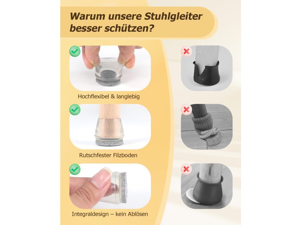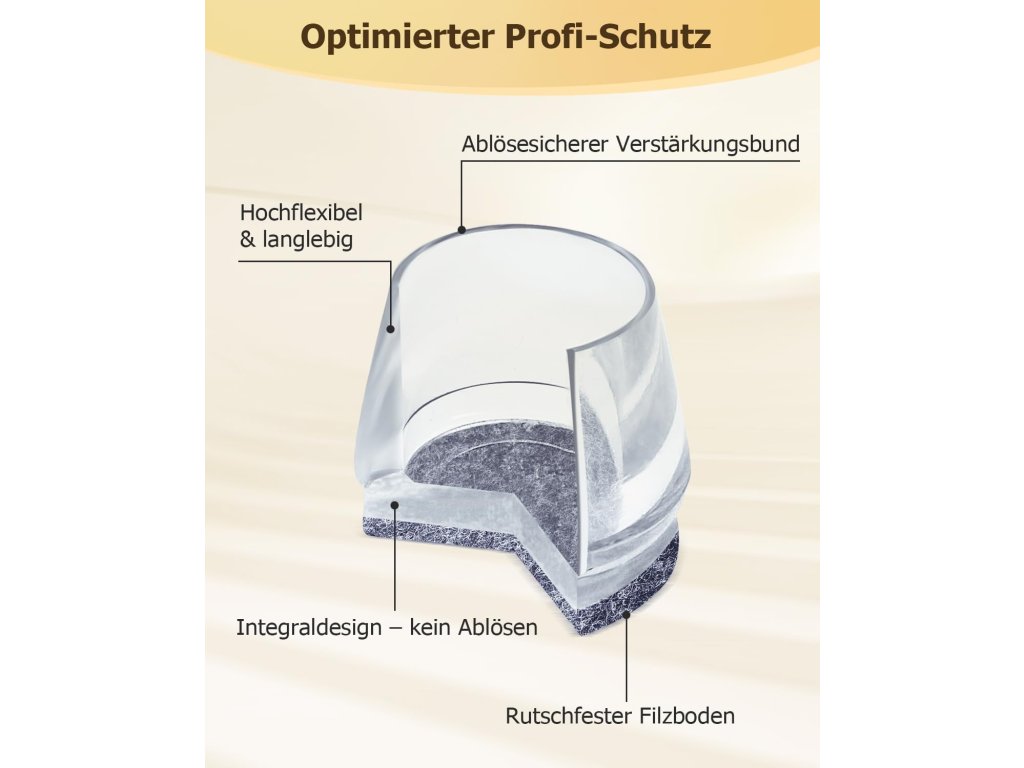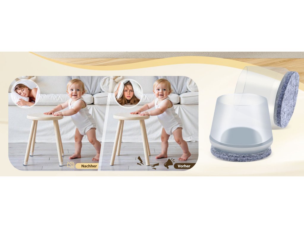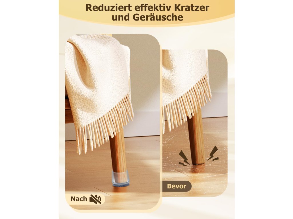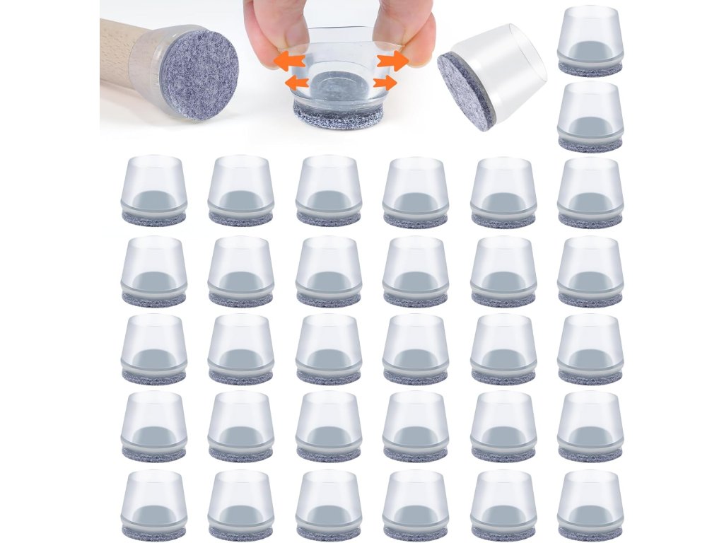 Průhledné silikonové krytky VABNEER chrání podlahu před poškrábáním a zajišťují tiché a plynulé posouvání židlí a dalšího nábytku. Integrovaná plstěná podložka pevně drží a neodlupuje se jako samolepicí varianty. Díky pružnému silikonu se krytky snadno nasazují a pevně obepínají kulaté nohy židlí v průměru 38–50 mm.