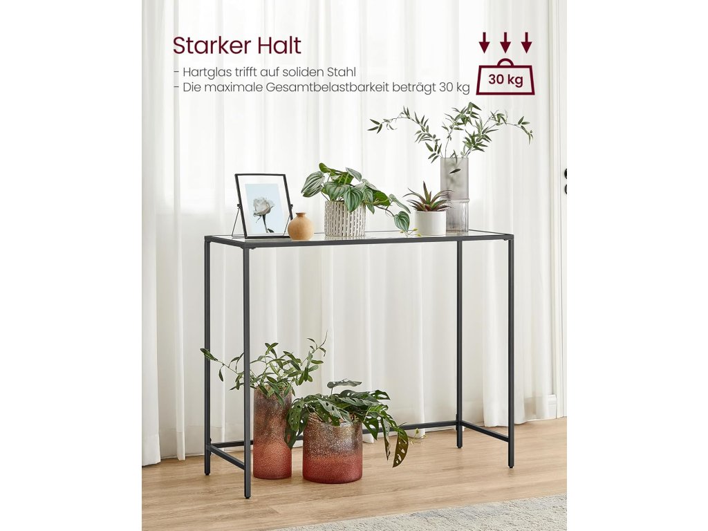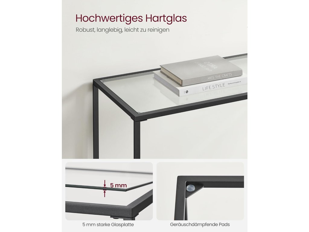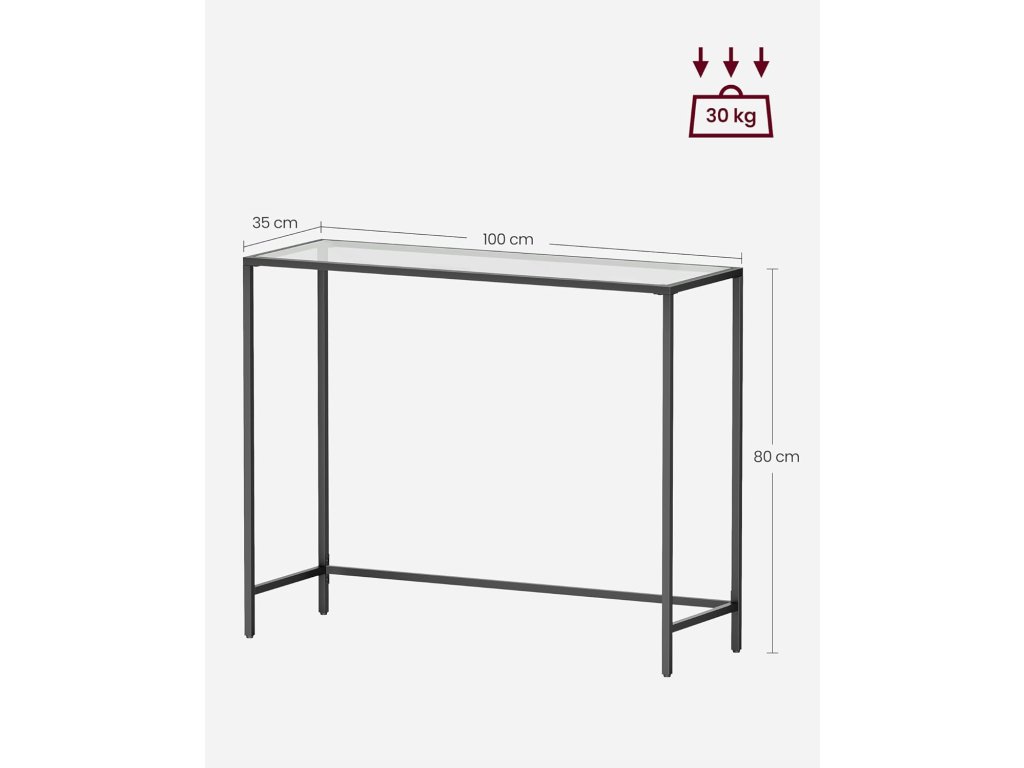 Konzolový stolek VASAGLE je minimalistický a elegantní kus nábytku, který se skvěle hodí do moderních interiérů. Kombinace černého kovového rámu a desky z tvrzeného skla působí vzdušně a nadčasově.