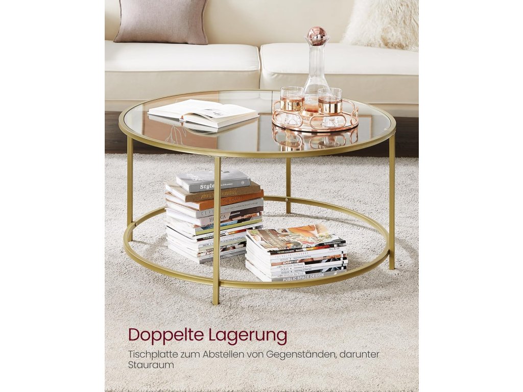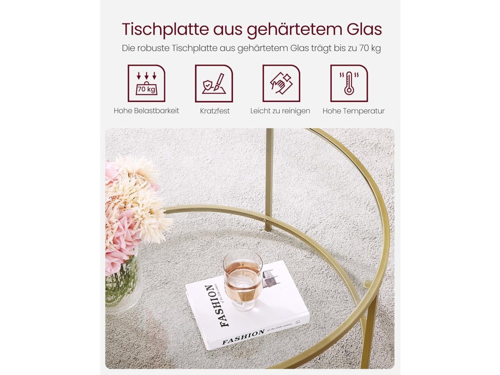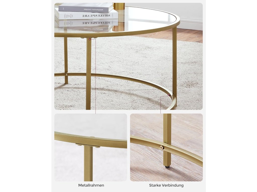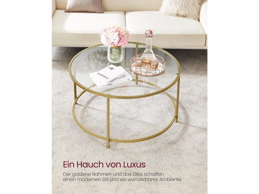 Stylový konferenční stolek VASAGLE v luxusním zlatém provedení dodá vašemu interiéru moderní a elegantní vzhled. Díky kombinaci ocelové konstrukce a skleněné desky působí lehce, vzdušně a zároveň stabilně.