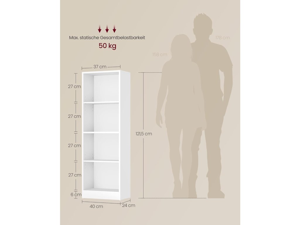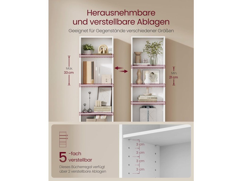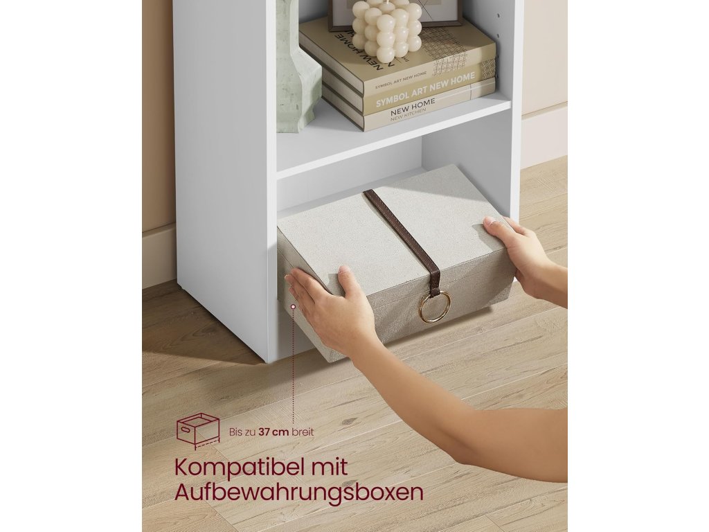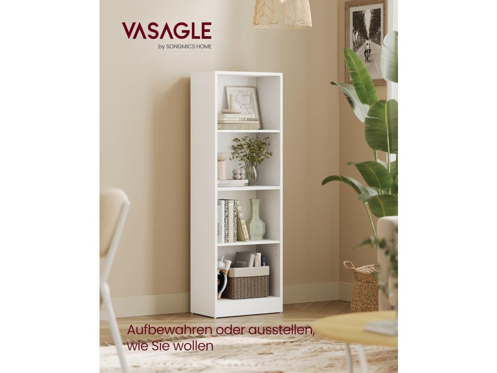 Elegantní a praktická knihovna VASAGLE LBC104W přináší ideální kombinaci jednoduchého designu, stability a funkčnosti. Díky svým kompaktním rozměrům se hodí i do menších prostor, kde poskytne dostatek místa na knihy, dekorace i úložné boxy.