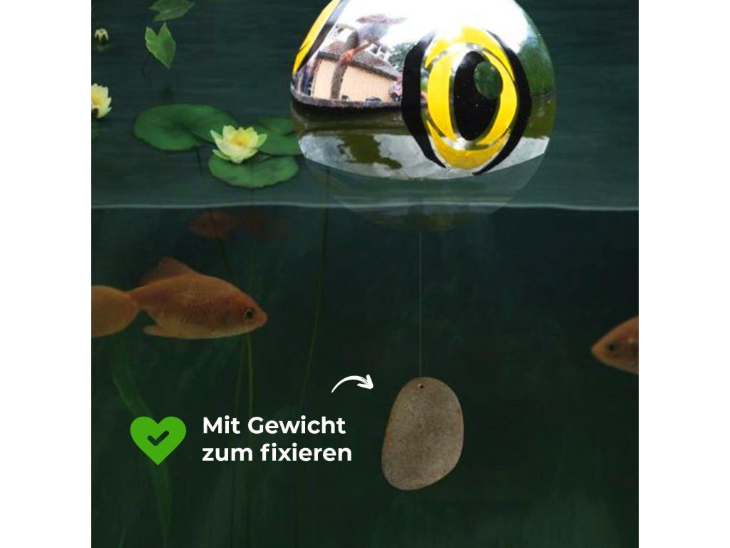 Kouli jednoduše položte na hladinu vody. Pro vyšší stabilitu ji můžete připevnit pomocí přiloženého vlasce a závaží. Doporučuje se umístit na viditelné místo v jezírku.