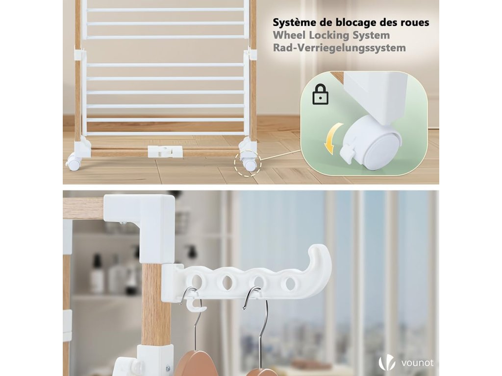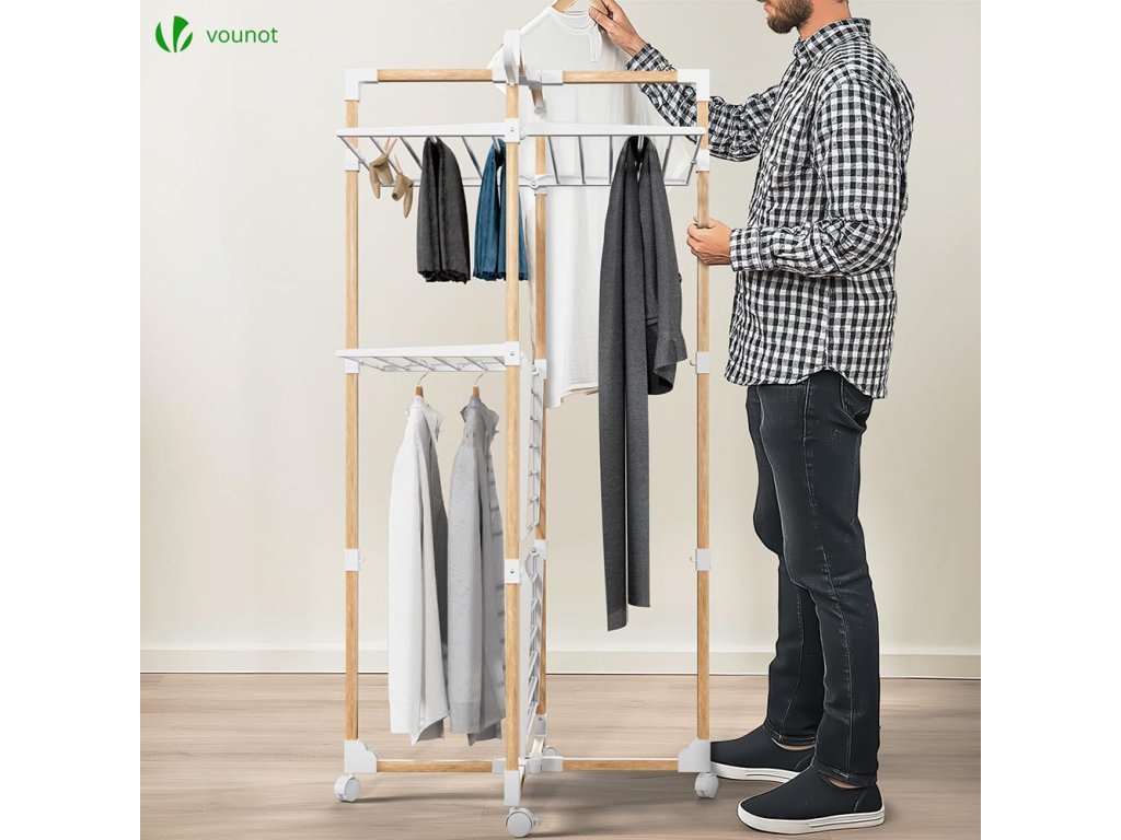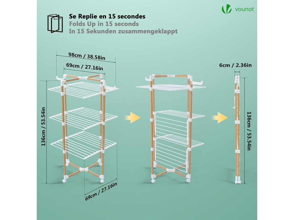 Praktický a prostorově efektivní sušák na prádlo značky VOUNOT nabízí tři úrovně pro zavěšení prádla, boční křídla pro ramínka a menší prádlo a kolečka pro snadné přesouvání. Po složení zabere minimum místa — ideální do bytu, na balkon i sušárnu.