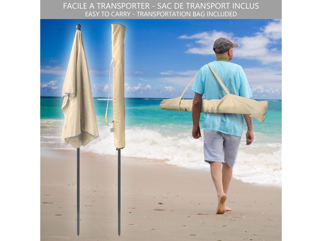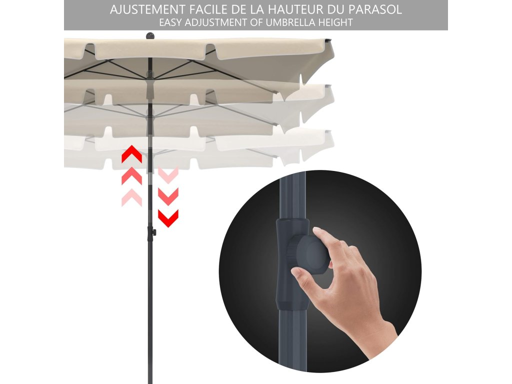 Slunečník je vybaven sklopným mechanismem pro snadné nastavení úhlu stínění během dne. Potah s UV ochranou 50+ pomáhá chránit před slunečním zářením. Stabilní středová tyč a pevná konstrukce zajišťují bezpečné používání.