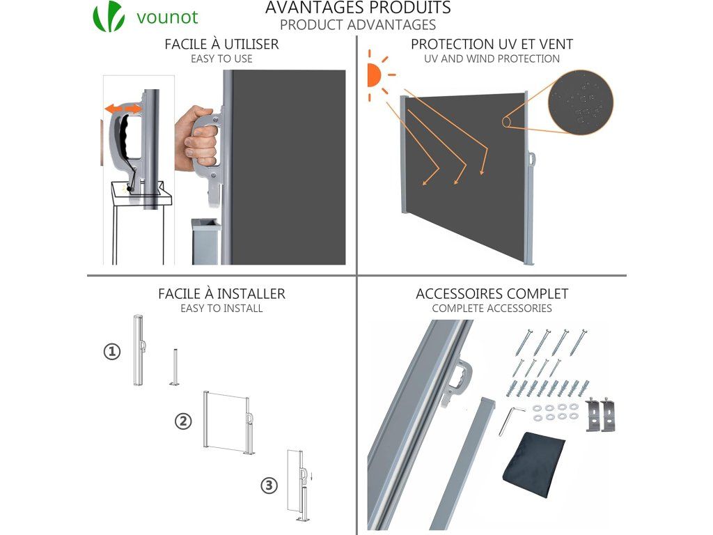 VOUNOT výsuvná boční markýza 160 × 300 cm je praktické řešení pro vytvoření soukromí a ochrany před větrem i sluncem na zahradě, terase nebo balkoně. Moderní šedé provedení se snadno sladí s venkovním prostředím. 🌿