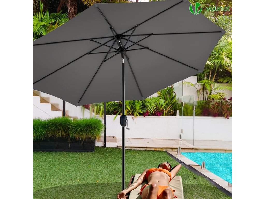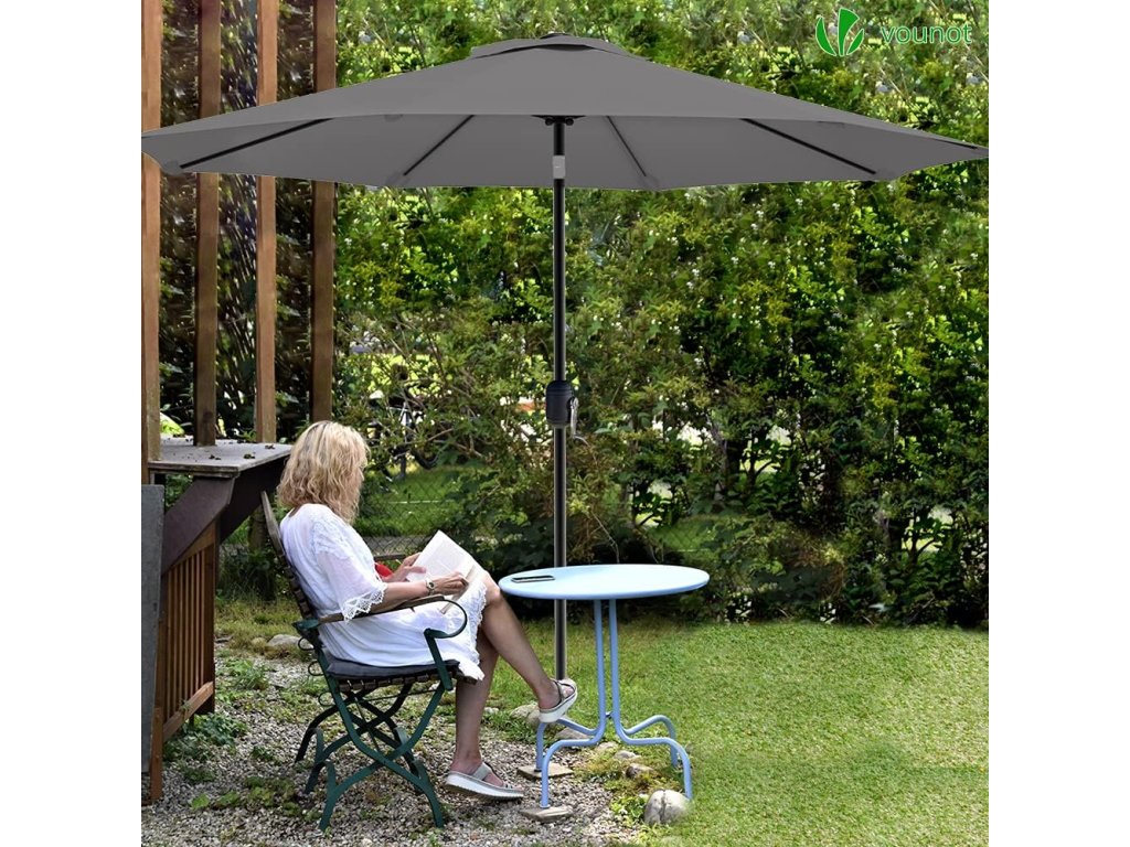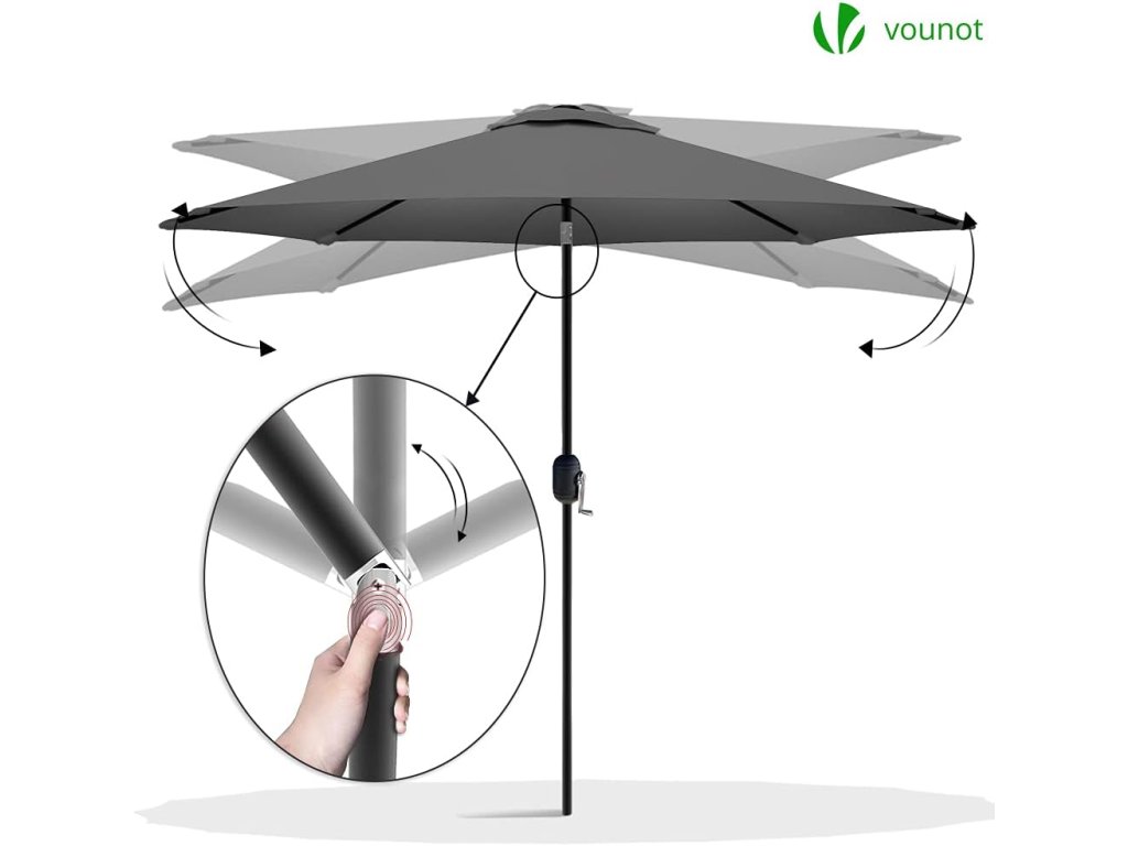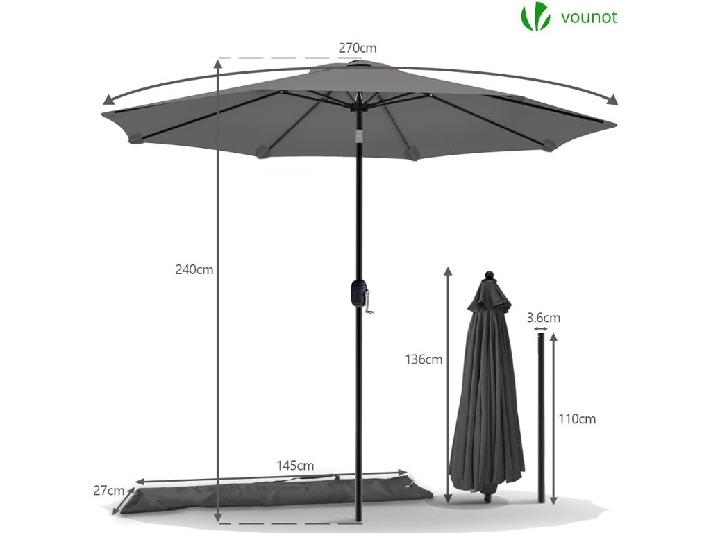 Zahradní slunečník VOUNOT s průměrem 270 cm poskytuje spolehlivý stín pro posezení na zahradě, terase nebo balkoně. Díky klikovému mechanismu je jeho rozkládání a skládání rychlé a pohodlné. Kvalitní polyesterová tkanina nabízí ochranu proti UV záření a pomáhá chránit před přímým sluncem během horkých letních dnů.