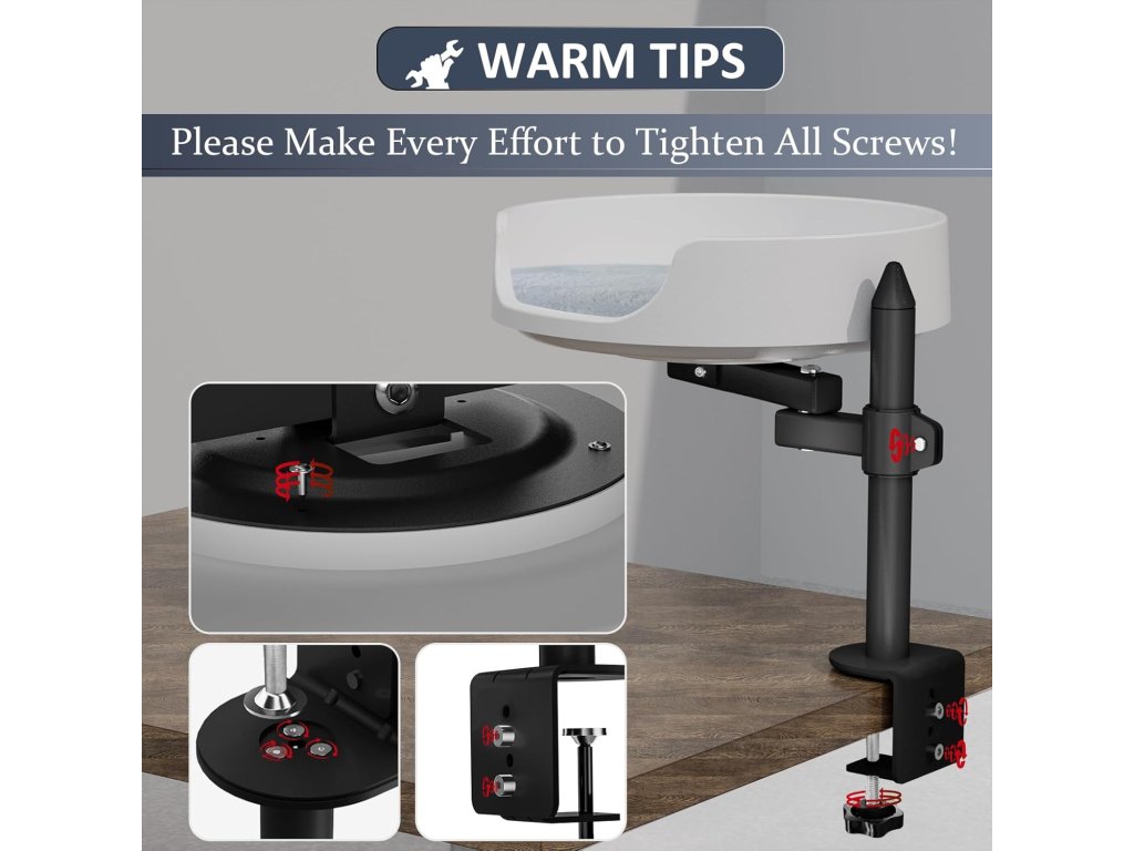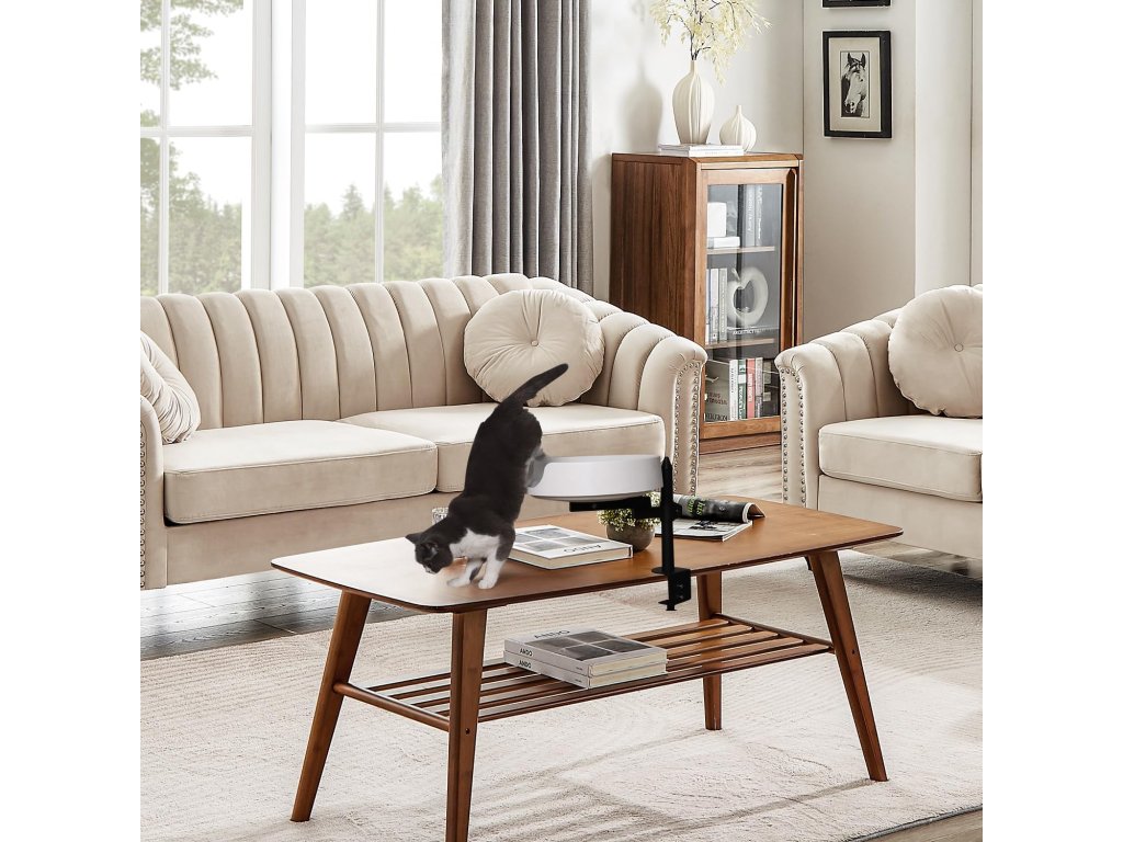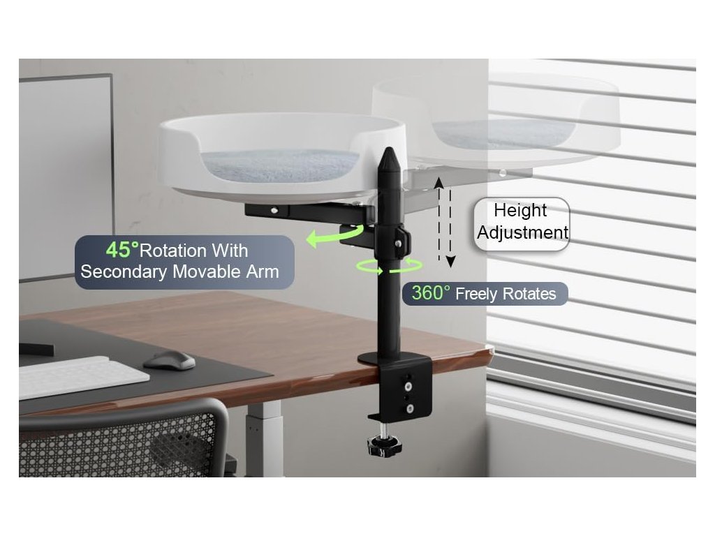 Díky otočné konstrukci s rozsahem 360° lze pelíšek snadno natočit do ideální polohy. Výškové nastavení umožňuje přizpůsobení různým typům stolů i preferencím kočky. Měkká podložka zajišťuje pohodlí při ležení i spaní.