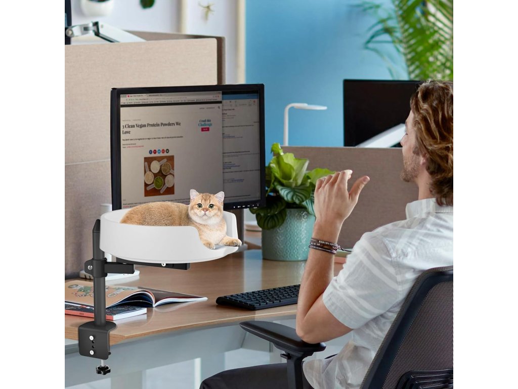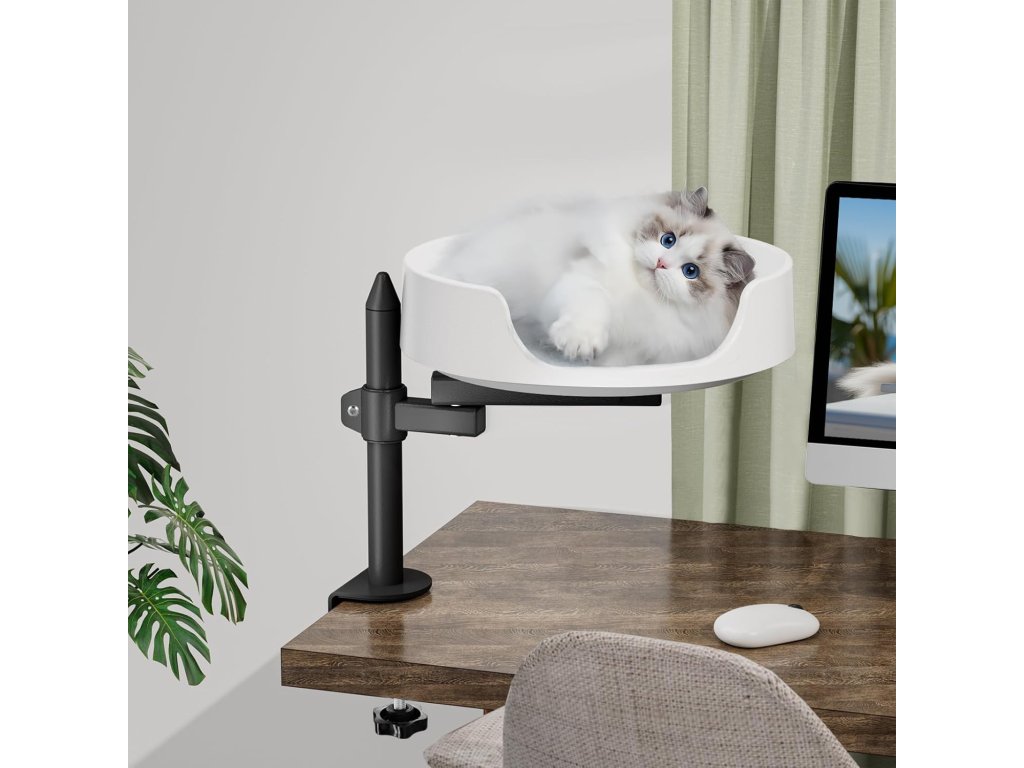 Vyvýšený kočičí pelíšek k psacímu stolu je ideálním řešením pro kočky, které chtějí být neustále v blízkosti svého majitele. Pelíšek se upevňuje přímo ke stolové desce pomocí pevné svěrky a nezabírá místo na pracovní ploše.