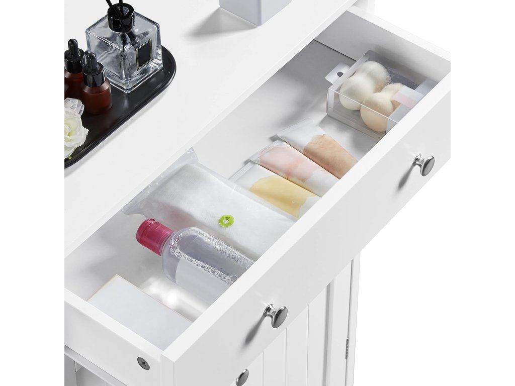 Horní zásuvka je ideální pro drobnosti, zatímco dvojité dveře skrývají vnitřní prostor s policí, kterou lze využít pro vyšší i menší předměty. Uzavřená konstrukce pomáhá udržet pořádek a chrání uložené věci před prachem a vlhkostí.