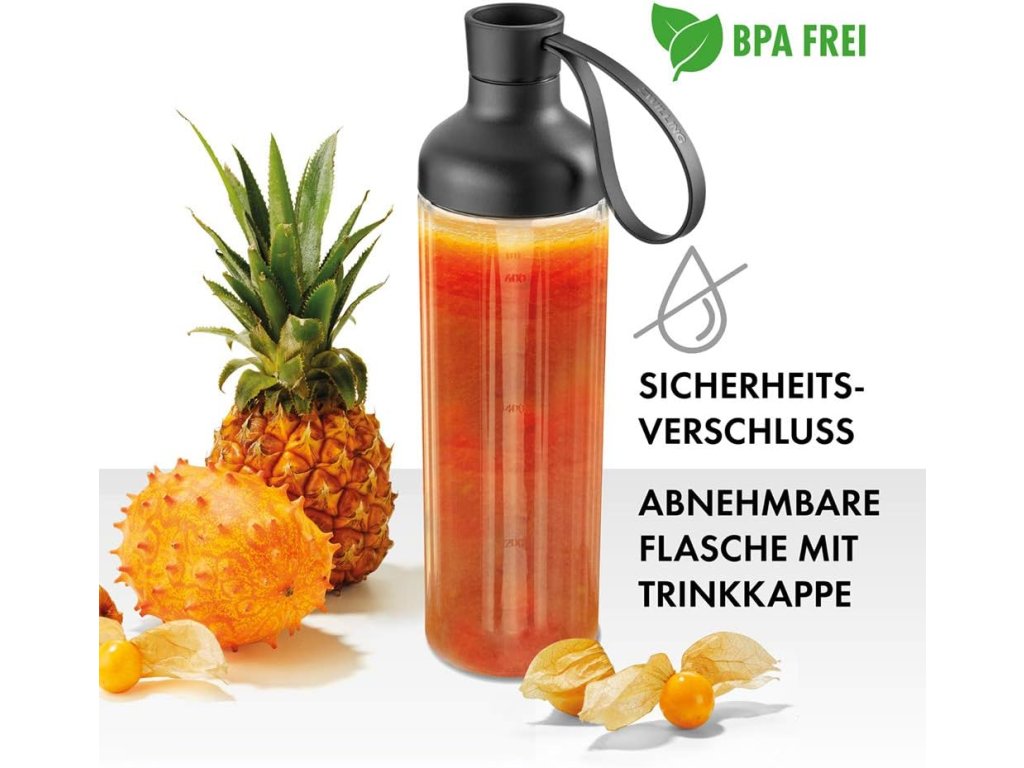 Průhledné tělo umožňuje snadnou kontrolu množství nápoje, zatímco integrovaná měrná stupnice pomáhá při přesném dávkování. Ergonomické víčko s pevným úchytem zajišťuje pohodlné přenášení a bezpečné uzavření bez protékání.